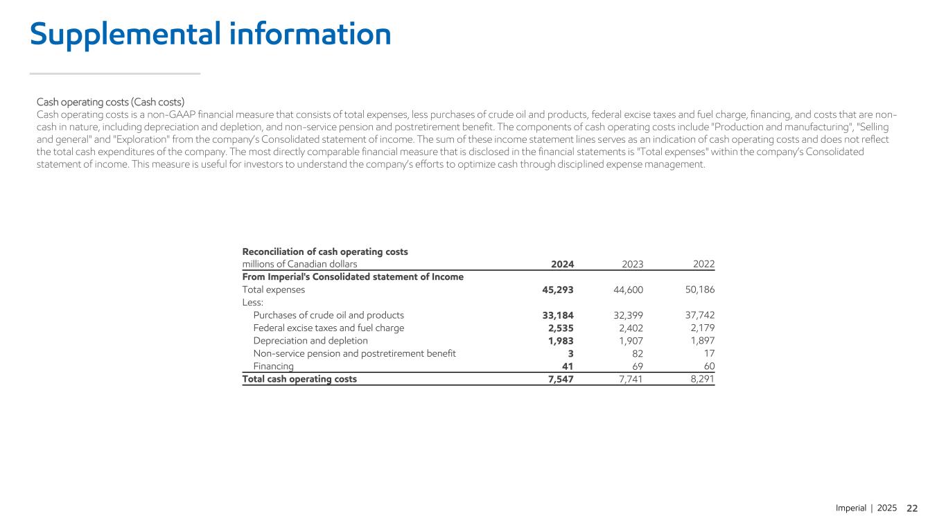 Imperial | 2025 Supplemental information Cash operating costs (Cash costs) Cash operating costs is a non-GAAP financial measure that consists of total expenses, less purchases of crude oil and products, federal excise taxes and fuel charge, financing, and costs that are non- cash in nature, including depreciation and depletion, and non-service pension and postretirement benefit. The components of cash operating costs include "Production and manufacturing", "Selling and general" and "Exploration" from the company’s Consolidated statement of income. The sum of these income statement lines serves as an indication of cash operating costs and does not reflect the total cash expenditures of the company. The most directly comparable financial measure that is disclosed in the financial statements is "Total expenses" within the company’s Consolidated statement of income. This measure is useful for investors to understand the company’s efforts to optimize cash through disciplined expense management. Reconciliation of cash operating costs millions of Canadian dollars 2024 2023 2022 From Imperial's Consolidated statement of Income Total expenses 45,293 44,600 50,186 Less: Purchases of crude oil and products 33,184 32,399 37,742 Federal excise taxes and fuel charge 2,535 2,402 2,179 Depreciation and depletion 1,983 1,907 1,897 Non-service pension and postretirement benefit 3 82 17 Financing 41 69 60 Total cash operating costs 7,547 7,741 8,291