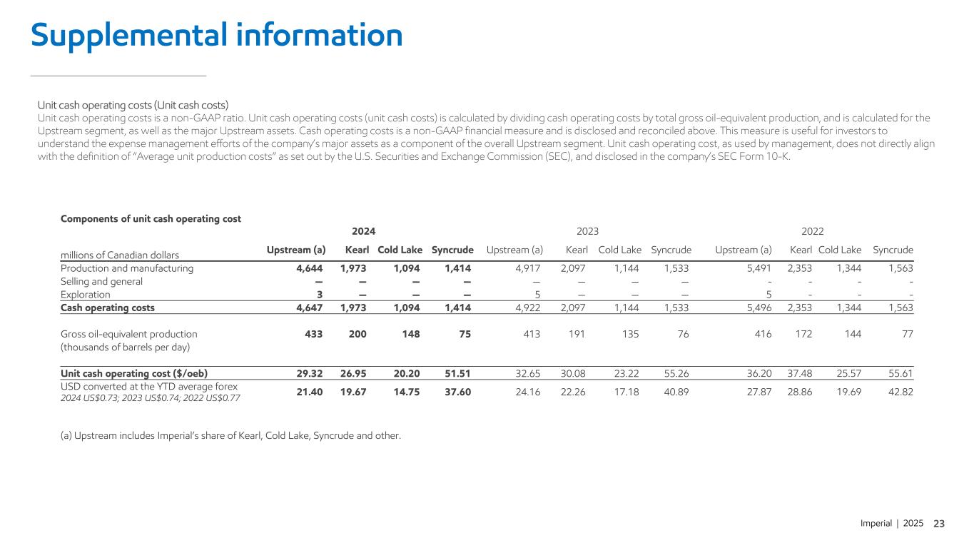 Imperial | 2025 Supplemental information Unit cash operating costs (Unit cash costs) Unit cash operating costs is a non-GAAP ratio. Unit cash operating costs (unit cash costs) is calculated by dividing cash operating costs by total gross oil-equivalent production, and is calculated for the Upstream segment, as well as the major Upstream assets. Cash operating costs is a non-GAAP financial measure and is disclosed and reconciled above. This measure is useful for investors to understand the expense management efforts of the company’s major assets as a component of the overall Upstream segment. Unit cash operating cost, as used by management, does not directly align with the definition of “Average unit production costs” as set out by the U.S. Securities and Exchange Commission (SEC), and disclosed in the company’s SEC Form 10-K. Components of unit cash operating cost 2024 2023 2022 millions of Canadian dollars Upstream (a) Kearl Cold Lake Syncrude Upstream (a) Kearl Cold Lake Syncrude Upstream (a) Kearl Cold Lake Syncrude Production and manufacturing 4,644 1,973 1,094 1,414 4,917 2,097 1,144 1,533 5,491 2,353 1,344 1,563 Selling and general — — — — — — — — - - - - Exploration 3 — — — 5 — — — 5 - - - Cash operating costs 4,647 1,973 1,094 1,414 4,922 2,097 1,144 1,533 5,496 2,353 1,344 1,563 Gross oil-equivalent production 433 200 148 75 413 191 135 76 416 172 144 77 (thousands of barrels per day) Unit cash operating cost ($/oeb) 29.32 26.95 20.20 51.51 32.65 30.08 23.22 55.26 36.20 37.48 25.57 55.61 USD converted at the YTD average forex 2024 US$0.73; 2023 US$0.74; 2022 US$0.77 21.40 19.67 14.75 37.60 24.16 22.26 17.18 40.89 27.87 28.86 19.69 42.82 (a) Upstream includes Imperial’s share of Kearl, Cold Lake, Syncrude and other.