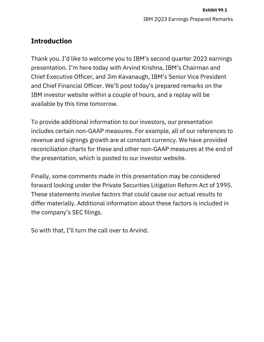 IBM 2Q23 Earnings Prepared Remarks Introduction Thank you. I’d like to welcome you to IBM’s second quarter 2023 earnings presentation. I’m here today with Arvind Krishna, IBM’s Chairman and Chief Executive Officer, and Jim Kavanaugh, IBM’s Senior Vice President and Chief Financial Officer. We’ll post today’s prepared remarks on the IBM investor website within a couple of hours, and a replay will be available by this time tomorrow. To provide additional information to our investors, our presentation includes certain non-GAAP measures. For example, all of our references to revenue and signings growth are at constant currency. We have provided reconciliation charts for these and other non-GAAP measures at the end of the presentation, which is posted to our investor website. Finally, some comments made in this presentation may be considered forward looking under the Private Securities Litigation Reform Act of 1995. These statements involve factors that could cause our actual results to differ materially. Additional information about these factors is included in the company’s SEC filings. So with that, I’ll turn the call over to Arvind. Exhibit 99.1