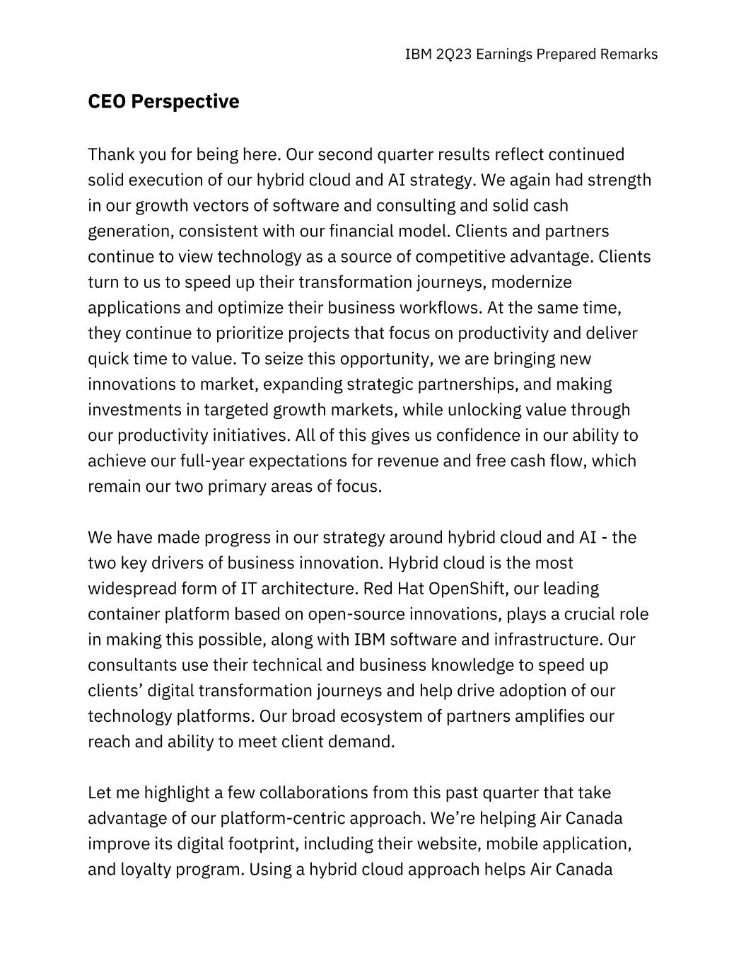 IBM 2Q23 Earnings Prepared Remarks CEO Perspective Thank you for being here. Our second quarter results reflect continued solid execution of our hybrid cloud and AI strategy. We again had strength in our growth vectors of software and consulting and solid cash generation, consistent with our financial model. Clients and partners continue to view technology as a source of competitive advantage. Clients turn to us to speed up their transformation journeys, modernize applications and optimize their business workflows. At the same time, they continue to prioritize projects that focus on productivity and deliver quick time to value. To seize this opportunity, we are bringing new innovations to market, expanding strategic partnerships, and making investments in targeted growth markets, while unlocking value through our productivity initiatives. All of this gives us confidence in our ability to achieve our full-year expectations for revenue and free cash flow, which remain our two primary areas of focus. We have made progress in our strategy around hybrid cloud and AI - the two key drivers of business innovation. Hybrid cloud is the most widespread form of IT architecture. Red Hat OpenShift, our leading container platform based on open-source innovations, plays a crucial role in making this possible, along with IBM software and infrastructure. Our consultants use their technical and business knowledge to speed up clients’ digital transformation journeys and help drive adoption of our technology platforms. Our broad ecosystem of partners amplifies our reach and ability to meet client demand. Let me highlight a few collaborations from this past quarter that take advantage of our platform-centric approach. We’re helping Air Canada improve its digital footprint, including their website, mobile application, and loyalty program. Using a hybrid cloud approach helps Air Canada