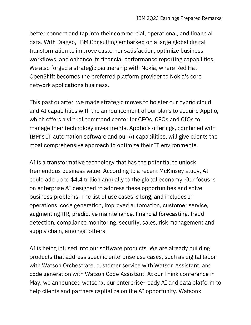 IBM 2Q23 Earnings Prepared Remarks better connect and tap into their commercial, operational, and financial data. With Diageo, IBM Consulting embarked on a large global digital transformation to improve customer satisfaction, optimize business workflows, and enhance its financial performance reporting capabilities. We also forged a strategic partnership with Nokia, where Red Hat OpenShift becomes the preferred platform provider to Nokia's core network applications business. This past quarter, we made strategic moves to bolster our hybrid cloud and AI capabilities with the announcement of our plans to acquire Apptio, which offers a virtual command center for CEOs, CFOs and CIOs to manage their technology investments. Apptio’s offerings, combined with IBM’s IT automation software and our AI capabilities, will give clients the most comprehensive approach to optimize their IT environments. AI is a transformative technology that has the potential to unlock tremendous business value. According to a recent McKinsey study, AI could add up to $4.4 trillion annually to the global economy. Our focus is on enterprise AI designed to address these opportunities and solve business problems. The list of use cases is long, and includes IT operations, code generation, improved automation, customer service, augmenting HR, predictive maintenance, financial forecasting, fraud detection, compliance monitoring, security, sales, risk management and supply chain, amongst others. AI is being infused into our software products. We are already building products that address specific enterprise use cases, such as digital labor with Watson Orchestrate, customer service with Watson Assistant, and code generation with Watson Code Assistant. At our Think conference in May, we announced watsonx, our enterprise-ready AI and data platform to help clients and partners capitalize on the AI opportunity. Watsonx
