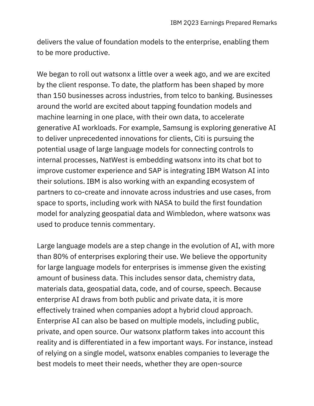 IBM 2Q23 Earnings Prepared Remarks delivers the value of foundation models to the enterprise, enabling them to be more productive. We began to roll out watsonx a little over a week ago, and we are excited by the client response. To date, the platform has been shaped by more than 150 businesses across industries, from telco to banking. Businesses around the world are excited about tapping foundation models and machine learning in one place, with their own data, to accelerate generative AI workloads. For example, Samsung is exploring generative AI to deliver unprecedented innovations for clients, Citi is pursuing the potential usage of large language models for connecting controls to internal processes, NatWest is embedding watsonx into its chat bot to improve customer experience and SAP is integrating IBM Watson AI into their solutions. IBM is also working with an expanding ecosystem of partners to co-create and innovate across industries and use cases, from space to sports, including work with NASA to build the first foundation model for analyzing geospatial data and Wimbledon, where watsonx was used to produce tennis commentary. Large language models are a step change in the evolution of AI, with more than 80% of enterprises exploring their use. We believe the opportunity for large language models for enterprises is immense given the existing amount of business data. This includes sensor data, chemistry data, materials data, geospatial data, code, and of course, speech. Because enterprise AI draws from both public and private data, it is more effectively trained when companies adopt a hybrid cloud approach. Enterprise AI can also be based on multiple models, including public, private, and open source. Our watsonx platform takes into account this reality and is differentiated in a few important ways. For instance, instead of relying on a single model, watsonx enables companies to leverage the best models to meet their needs, whether they are open-source