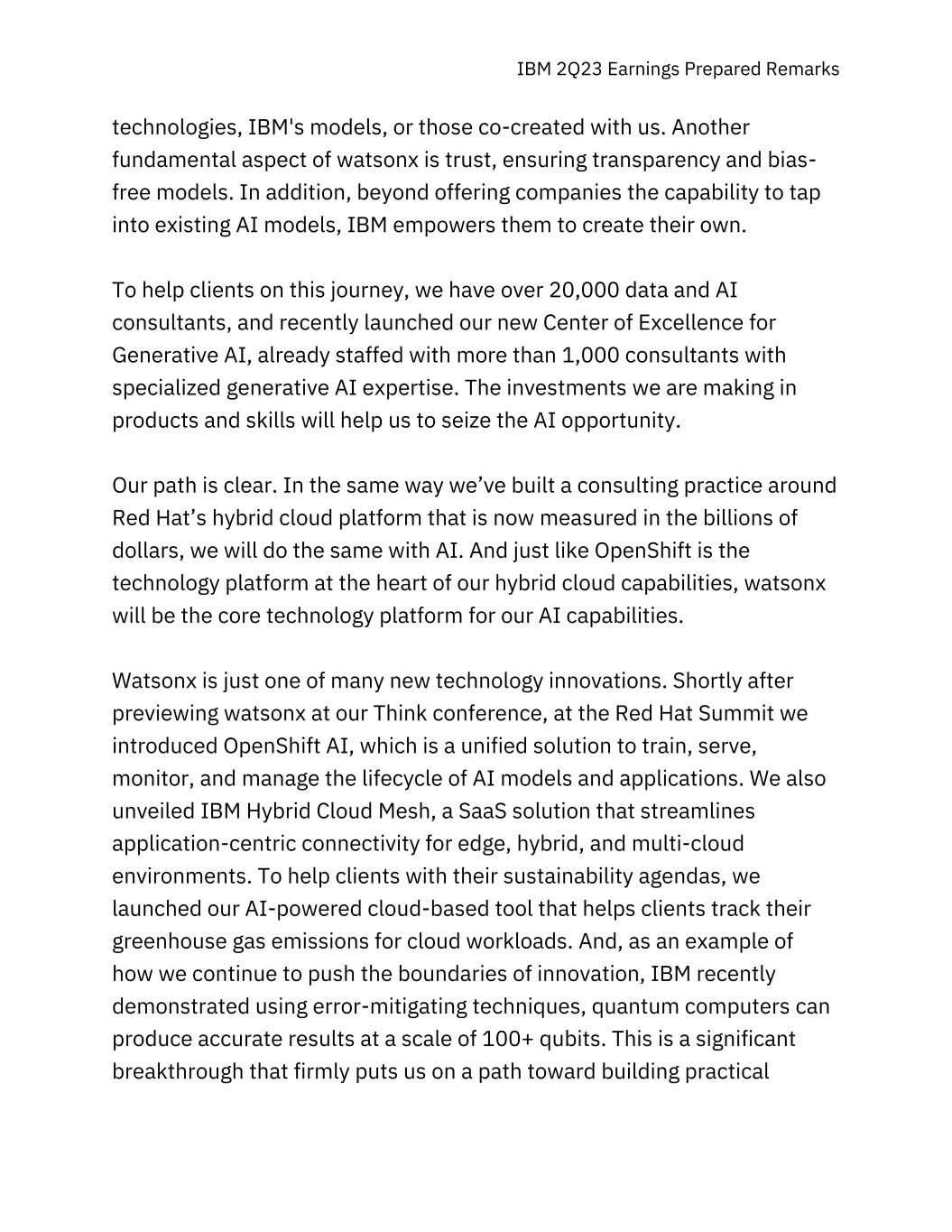 IBM 2Q23 Earnings Prepared Remarks technologies, IBM's models, or those co-created with us. Another fundamental aspect of watsonx is trust, ensuring transparency and bias- free models. In addition, beyond offering companies the capability to tap into existing AI models, IBM empowers them to create their own. To help clients on this journey, we have over 20,000 data and AI consultants, and recently launched our new Center of Excellence for Generative AI, already staffed with more than 1,000 consultants with specialized generative AI expertise. The investments we are making in products and skills will help us to seize the AI opportunity. Our path is clear. In the same way we’ve built a consulting practice around Red Hat’s hybrid cloud platform that is now measured in the billions of dollars, we will do the same with AI. And just like OpenShift is the technology platform at the heart of our hybrid cloud capabilities, watsonx will be the core technology platform for our AI capabilities. Watsonx is just one of many new technology innovations. Shortly after previewing watsonx at our Think conference, at the Red Hat Summit we introduced OpenShift AI, which is a unified solution to train, serve, monitor, and manage the lifecycle of AI models and applications. We also unveiled IBM Hybrid Cloud Mesh, a SaaS solution that streamlines application-centric connectivity for edge, hybrid, and multi-cloud environments. To help clients with their sustainability agendas, we launched our AI-powered cloud-based tool that helps clients track their greenhouse gas emissions for cloud workloads. And, as an example of how we continue to push the boundaries of innovation, IBM recently demonstrated using error-mitigating techniques, quantum computers can produce accurate results at a scale of 100+ qubits. This is a significant breakthrough that firmly puts us on a path toward building practical