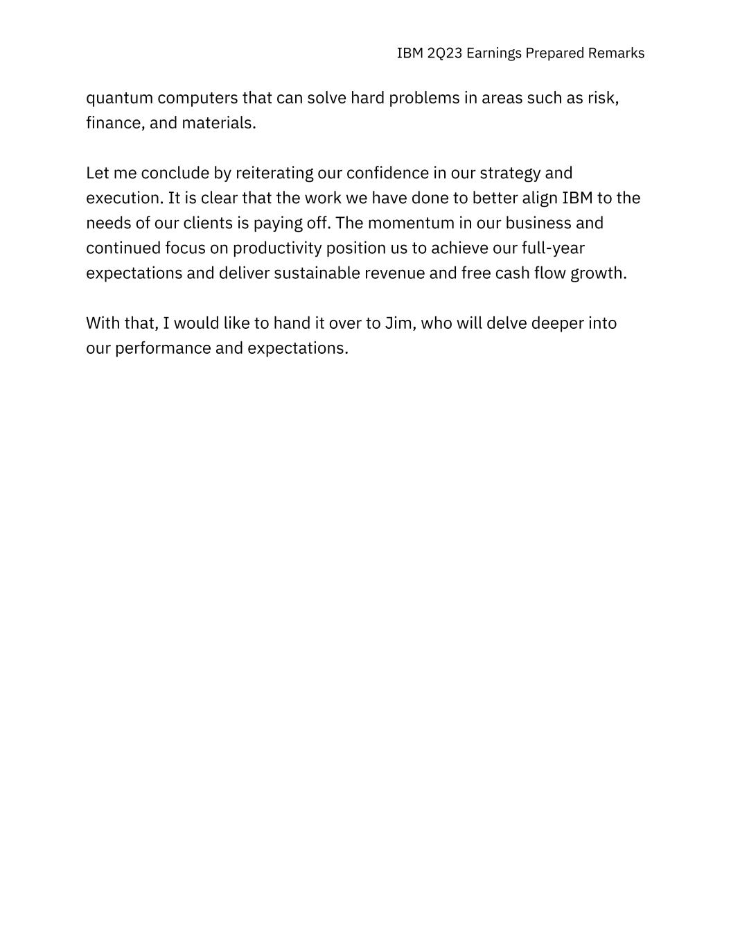 IBM 2Q23 Earnings Prepared Remarks quantum computers that can solve hard problems in areas such as risk, finance, and materials. Let me conclude by reiterating our confidence in our strategy and execution. It is clear that the work we have done to better align IBM to the needs of our clients is paying off. The momentum in our business and continued focus on productivity position us to achieve our full-year expectations and deliver sustainable revenue and free cash flow growth. With that, I would like to hand it over to Jim, who will delve deeper into our performance and expectations.