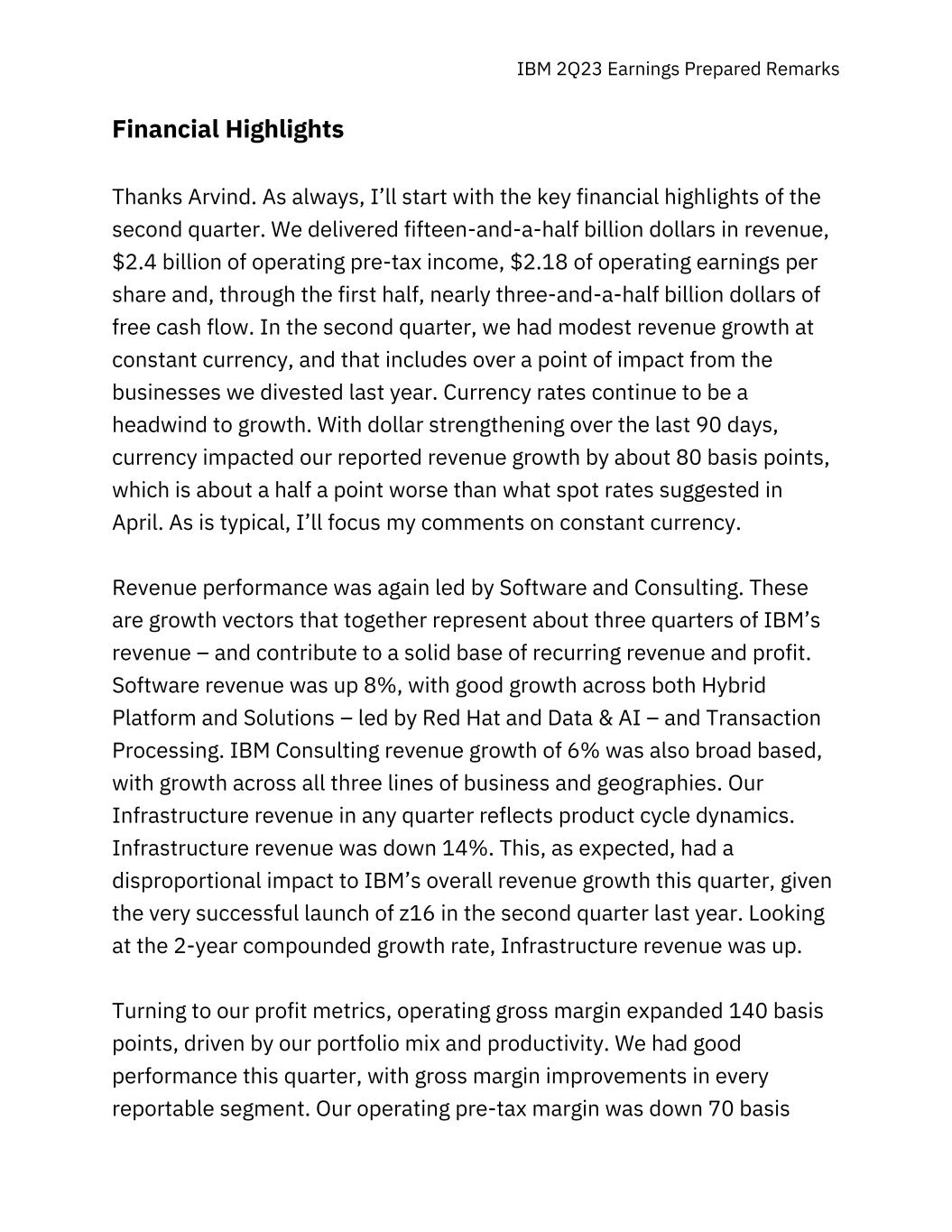 IBM 2Q23 Earnings Prepared Remarks Financial Highlights Thanks Arvind. As always, I’ll start with the key financial highlights of the second quarter. We delivered fifteen-and-a-half billion dollars in revenue, $2.4 billion of operating pre-tax income, $2.18 of operating earnings per share and, through the first half, nearly three-and-a-half billion dollars of free cash flow. In the second quarter, we had modest revenue growth at constant currency, and that includes over a point of impact from the businesses we divested last year. Currency rates continue to be a headwind to growth. With dollar strengthening over the last 90 days, currency impacted our reported revenue growth by about 80 basis points, which is about a half a point worse than what spot rates suggested in April. As is typical, I’ll focus my comments on constant currency. Revenue performance was again led by Software and Consulting. These are growth vectors that together represent about three quarters of IBM’s revenue – and contribute to a solid base of recurring revenue and profit. Software revenue was up 8%, with good growth across both Hybrid Platform and Solutions – led by Red Hat and Data & AI – and Transaction Processing. IBM Consulting revenue growth of 6% was also broad based, with growth across all three lines of business and geographies. Our Infrastructure revenue in any quarter reflects product cycle dynamics. Infrastructure revenue was down 14%. This, as expected, had a disproportional impact to IBM’s overall revenue growth this quarter, given the very successful launch of z16 in the second quarter last year. Looking at the 2-year compounded growth rate, Infrastructure revenue was up. Turning to our profit metrics, operating gross margin expanded 140 basis points, driven by our portfolio mix and productivity. We had good performance this quarter, with gross margin improvements in every reportable segment. Our operating pre-tax margin was down 70 basis