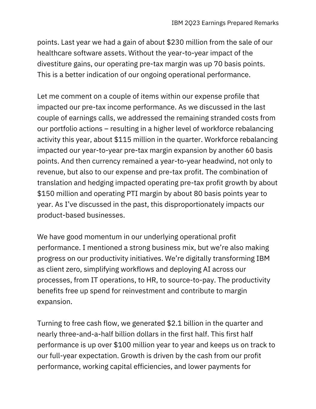 IBM 2Q23 Earnings Prepared Remarks points. Last year we had a gain of about $230 million from the sale of our healthcare software assets. Without the year-to-year impact of the divestiture gains, our operating pre-tax margin was up 70 basis points. This is a better indication of our ongoing operational performance. Let me comment on a couple of items within our expense profile that impacted our pre-tax income performance. As we discussed in the last couple of earnings calls, we addressed the remaining stranded costs from our portfolio actions – resulting in a higher level of workforce rebalancing activity this year, about $115 million in the quarter. Workforce rebalancing impacted our year-to-year pre-tax margin expansion by another 60 basis points. And then currency remained a year-to-year headwind, not only to revenue, but also to our expense and pre-tax profit. The combination of translation and hedging impacted operating pre-tax profit growth by about $150 million and operating PTI margin by about 80 basis points year to year. As I’ve discussed in the past, this disproportionately impacts our product-based businesses. We have good momentum in our underlying operational profit performance. I mentioned a strong business mix, but we’re also making progress on our productivity initiatives. We’re digitally transforming IBM as client zero, simplifying workflows and deploying AI across our processes, from IT operations, to HR, to source-to-pay. The productivity benefits free up spend for reinvestment and contribute to margin expansion. Turning to free cash flow, we generated $2.1 billion in the quarter and nearly three-and-a-half billion dollars in the first half. This first half performance is up over $100 million year to year and keeps us on track to our full-year expectation. Growth is driven by the cash from our profit performance, working capital efficiencies, and lower payments for