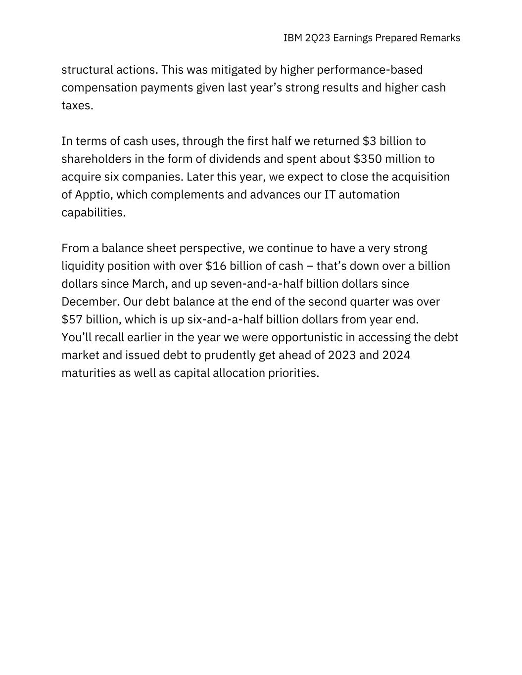 IBM 2Q23 Earnings Prepared Remarks structural actions. This was mitigated by higher performance-based compensation payments given last year’s strong results and higher cash taxes. In terms of cash uses, through the first half we returned $3 billion to shareholders in the form of dividends and spent about $350 million to acquire six companies. Later this year, we expect to close the acquisition of Apptio, which complements and advances our IT automation capabilities. From a balance sheet perspective, we continue to have a very strong liquidity position with over $16 billion of cash – that’s down over a billion dollars since March, and up seven-and-a-half billion dollars since December. Our debt balance at the end of the second quarter was over $57 billion, which is up six-and-a-half billion dollars from year end. You’ll recall earlier in the year we were opportunistic in accessing the debt market and issued debt to prudently get ahead of 2023 and 2024 maturities as well as capital allocation priorities.