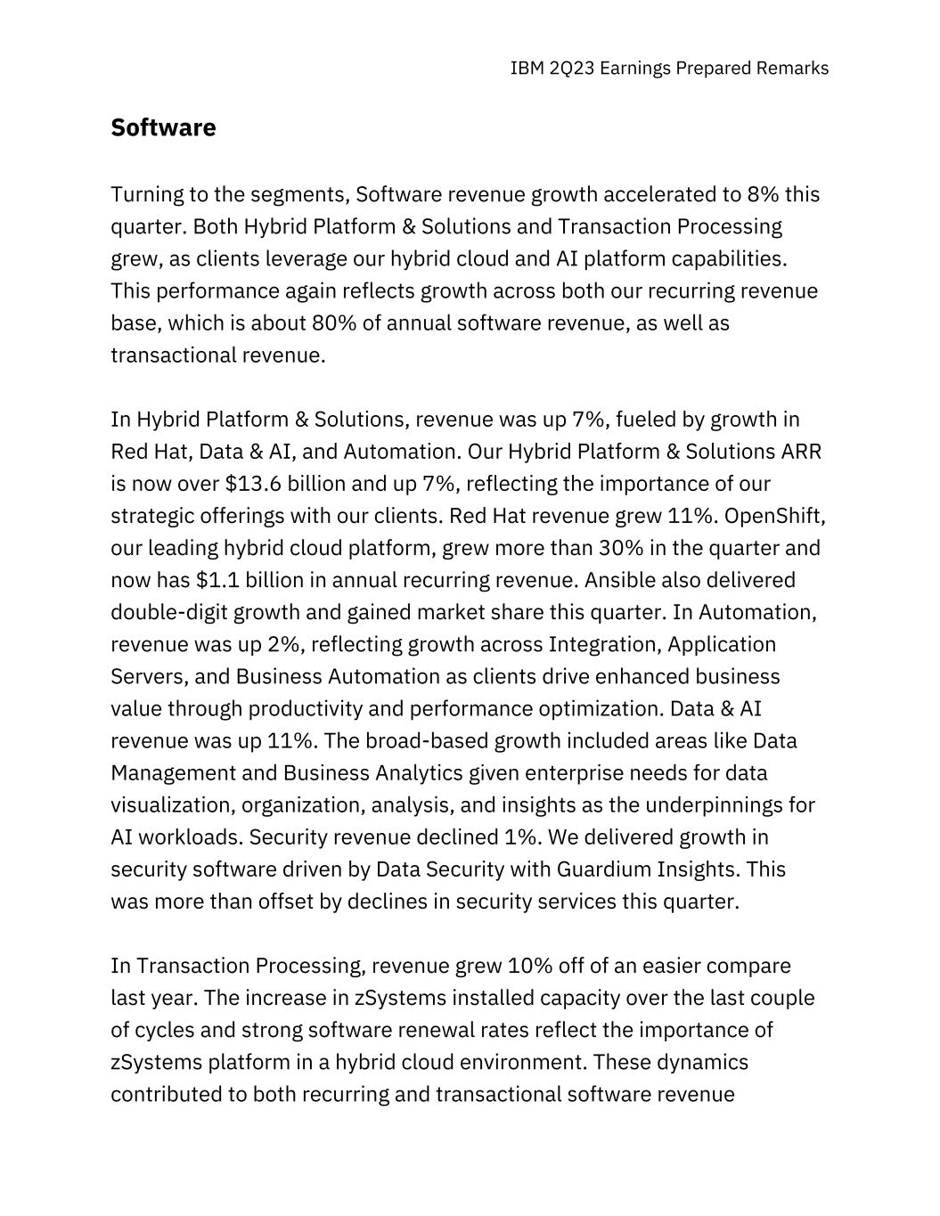IBM 2Q23 Earnings Prepared Remarks Software Turning to the segments, Software revenue growth accelerated to 8% this quarter. Both Hybrid Platform & Solutions and Transaction Processing grew, as clients leverage our hybrid cloud and AI platform capabilities. This performance again reflects growth across both our recurring revenue base, which is about 80% of annual software revenue, as well as transactional revenue. In Hybrid Platform & Solutions, revenue was up 7%, fueled by growth in Red Hat, Data & AI, and Automation. Our Hybrid Platform & Solutions ARR is now over $13.6 billion and up 7%, reflecting the importance of our strategic offerings with our clients. Red Hat revenue grew 11%. OpenShift, our leading hybrid cloud platform, grew more than 30% in the quarter and now has $1.1 billion in annual recurring revenue. Ansible also delivered double-digit growth and gained market share this quarter. In Automation, revenue was up 2%, reflecting growth across Integration, Application Servers, and Business Automation as clients drive enhanced business value through productivity and performance optimization. Data & AI revenue was up 11%. The broad-based growth included areas like Data Management and Business Analytics given enterprise needs for data visualization, organization, analysis, and insights as the underpinnings for AI workloads. Security revenue declined 1%. We delivered growth in security software driven by Data Security with Guardium Insights. This was more than offset by declines in security services this quarter. In Transaction Processing, revenue grew 10% off of an easier compare last year. The increase in zSystems installed capacity over the last couple of cycles and strong software renewal rates reflect the importance of zSystems platform in a hybrid cloud environment. These dynamics contributed to both recurring and transactional software revenue