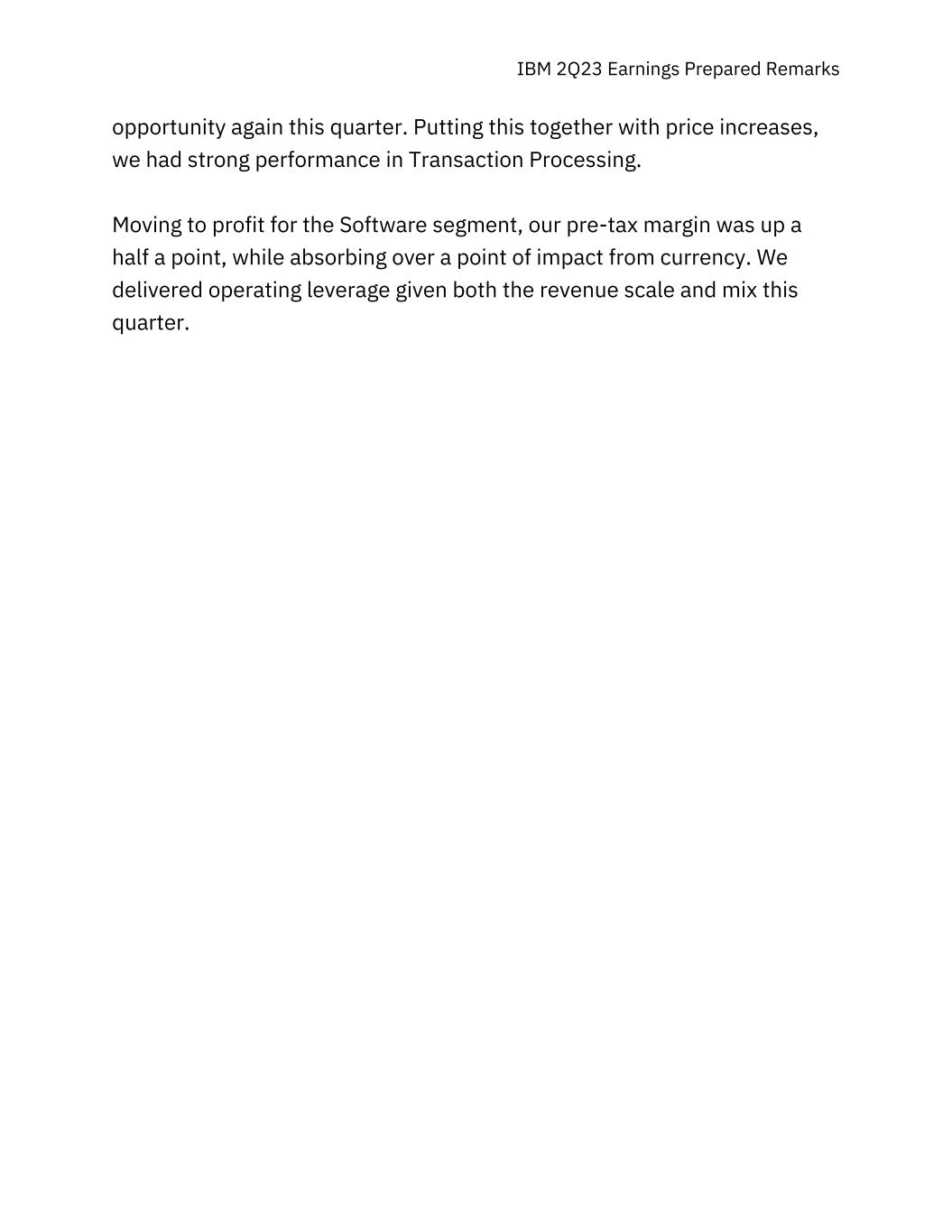 IBM 2Q23 Earnings Prepared Remarks opportunity again this quarter. Putting this together with price increases, we had strong performance in Transaction Processing. Moving to profit for the Software segment, our pre-tax margin was up a half a point, while absorbing over a point of impact from currency. We delivered operating leverage given both the revenue scale and mix this quarter.