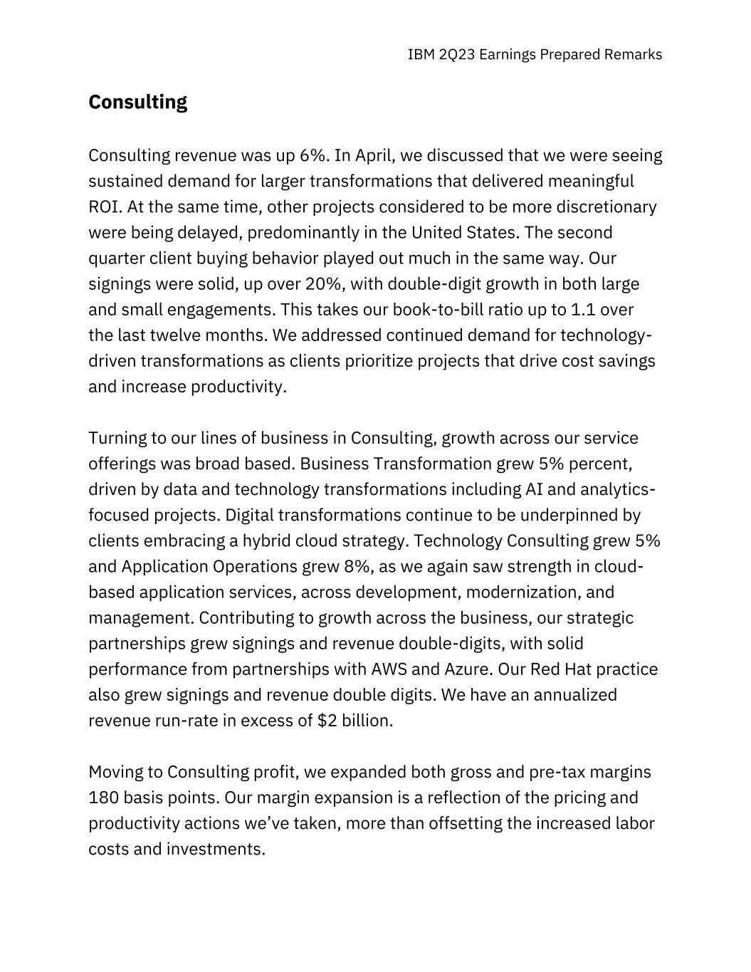 IBM 2Q23 Earnings Prepared Remarks Consulting Consulting revenue was up 6%. In April, we discussed that we were seeing sustained demand for larger transformations that delivered meaningful ROI. At the same time, other projects considered to be more discretionary were being delayed, predominantly in the United States. The second quarter client buying behavior played out much in the same way. Our signings were solid, up over 20%, with double-digit growth in both large and small engagements. This takes our book-to-bill ratio up to 1.1 over the last twelve months. We addressed continued demand for technology- driven transformations as clients prioritize projects that drive cost savings and increase productivity. Turning to our lines of business in Consulting, growth across our service offerings was broad based. Business Transformation grew 5% percent, driven by data and technology transformations including AI and analytics- focused projects. Digital transformations continue to be underpinned by clients embracing a hybrid cloud strategy. Technology Consulting grew 5% and Application Operations grew 8%, as we again saw strength in cloud- based application services, across development, modernization, and management. Contributing to growth across the business, our strategic partnerships grew signings and revenue double-digits, with solid performance from partnerships with AWS and Azure. Our Red Hat practice also grew signings and revenue double digits. We have an annualized revenue run-rate in excess of $2 billion. Moving to Consulting profit, we expanded both gross and pre-tax margins 180 basis points. Our margin expansion is a reflection of the pricing and productivity actions we’ve taken, more than offsetting the increased labor costs and investments.