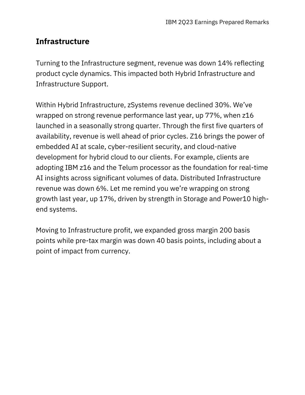 IBM 2Q23 Earnings Prepared Remarks Infrastructure Turning to the Infrastructure segment, revenue was down 14% reflecting product cycle dynamics. This impacted both Hybrid Infrastructure and Infrastructure Support. Within Hybrid Infrastructure, zSystems revenue declined 30%. We’ve wrapped on strong revenue performance last year, up 77%, when z16 launched in a seasonally strong quarter. Through the first five quarters of availability, revenue is well ahead of prior cycles. Z16 brings the power of embedded AI at scale, cyber-resilient security, and cloud-native development for hybrid cloud to our clients. For example, clients are adopting IBM z16 and the Telum processor as the foundation for real-time AI insights across significant volumes of data. Distributed Infrastructure revenue was down 6%. Let me remind you we’re wrapping on strong growth last year, up 17%, driven by strength in Storage and Power10 high- end systems. Moving to Infrastructure profit, we expanded gross margin 200 basis points while pre-tax margin was down 40 basis points, including about a point of impact from currency.