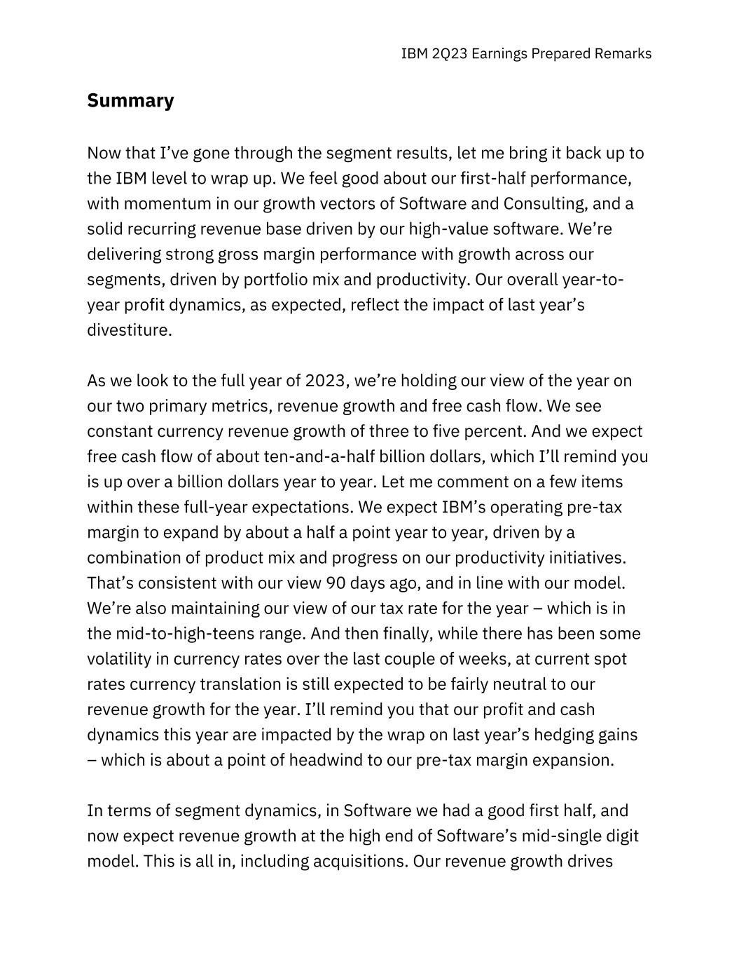 IBM 2Q23 Earnings Prepared Remarks Summary Now that I’ve gone through the segment results, let me bring it back up to the IBM level to wrap up. We feel good about our first-half performance, with momentum in our growth vectors of Software and Consulting, and a solid recurring revenue base driven by our high-value software. We’re delivering strong gross margin performance with growth across our segments, driven by portfolio mix and productivity. Our overall year-to- year profit dynamics, as expected, reflect the impact of last year’s divestiture. As we look to the full year of 2023, we’re holding our view of the year on our two primary metrics, revenue growth and free cash flow. We see constant currency revenue growth of three to five percent. And we expect free cash flow of about ten-and-a-half billion dollars, which I’ll remind you is up over a billion dollars year to year. Let me comment on a few items within these full-year expectations. We expect IBM’s operating pre-tax margin to expand by about a half a point year to year, driven by a combination of product mix and progress on our productivity initiatives. That’s consistent with our view 90 days ago, and in line with our model. We’re also maintaining our view of our tax rate for the year – which is in the mid-to-high-teens range. And then finally, while there has been some volatility in currency rates over the last couple of weeks, at current spot rates currency translation is still expected to be fairly neutral to our revenue growth for the year. I’ll remind you that our profit and cash dynamics this year are impacted by the wrap on last year’s hedging gains – which is about a point of headwind to our pre-tax margin expansion. In terms of segment dynamics, in Software we had a good first half, and now expect revenue growth at the high end of Software’s mid-single digit model. This is all in, including acquisitions. Our revenue growth drives