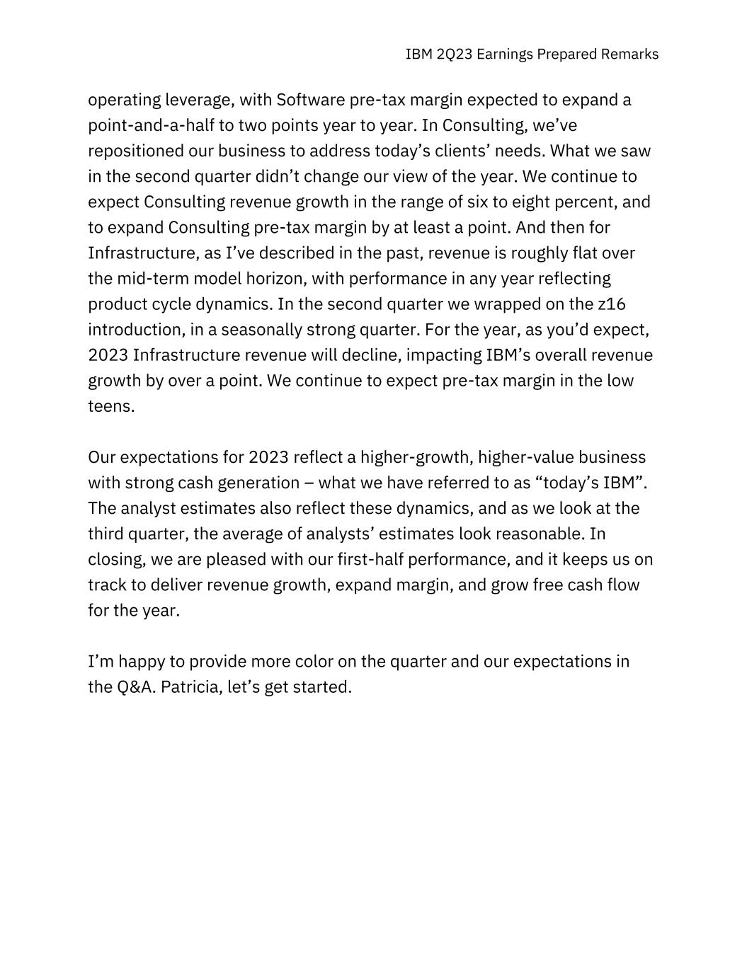 IBM 2Q23 Earnings Prepared Remarks operating leverage, with Software pre-tax margin expected to expand a point-and-a-half to two points year to year. In Consulting, we’ve repositioned our business to address today’s clients’ needs. What we saw in the second quarter didn’t change our view of the year. We continue to expect Consulting revenue growth in the range of six to eight percent, and to expand Consulting pre-tax margin by at least a point. And then for Infrastructure, as I’ve described in the past, revenue is roughly flat over the mid-term model horizon, with performance in any year reflecting product cycle dynamics. In the second quarter we wrapped on the z16 introduction, in a seasonally strong quarter. For the year, as you’d expect, 2023 Infrastructure revenue will decline, impacting IBM’s overall revenue growth by over a point. We continue to expect pre-tax margin in the low teens. Our expectations for 2023 reflect a higher-growth, higher-value business with strong cash generation – what we have referred to as “today’s IBM”. The analyst estimates also reflect these dynamics, and as we look at the third quarter, the average of analysts’ estimates look reasonable. In closing, we are pleased with our first-half performance, and it keeps us on track to deliver revenue growth, expand margin, and grow free cash flow for the year. I’m happy to provide more color on the quarter and our expectations in the Q&A. Patricia, let’s get started.