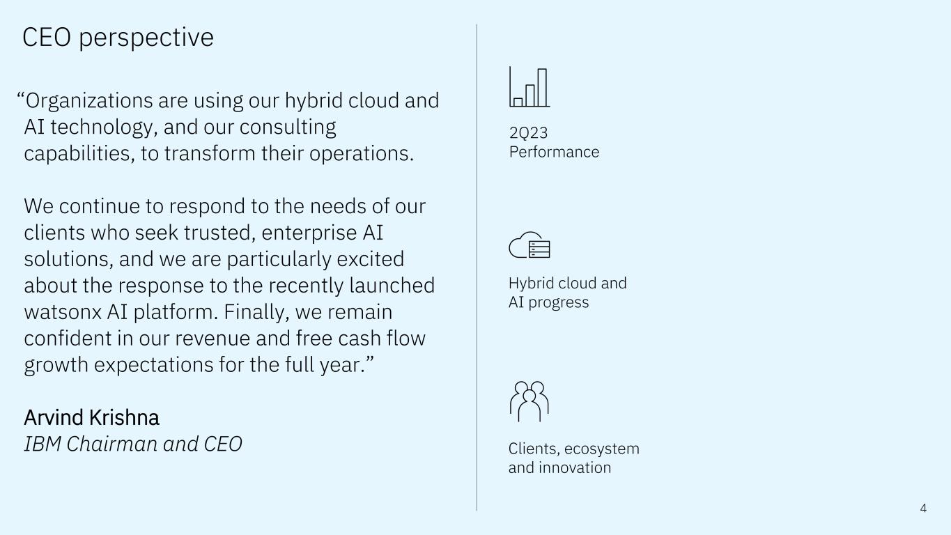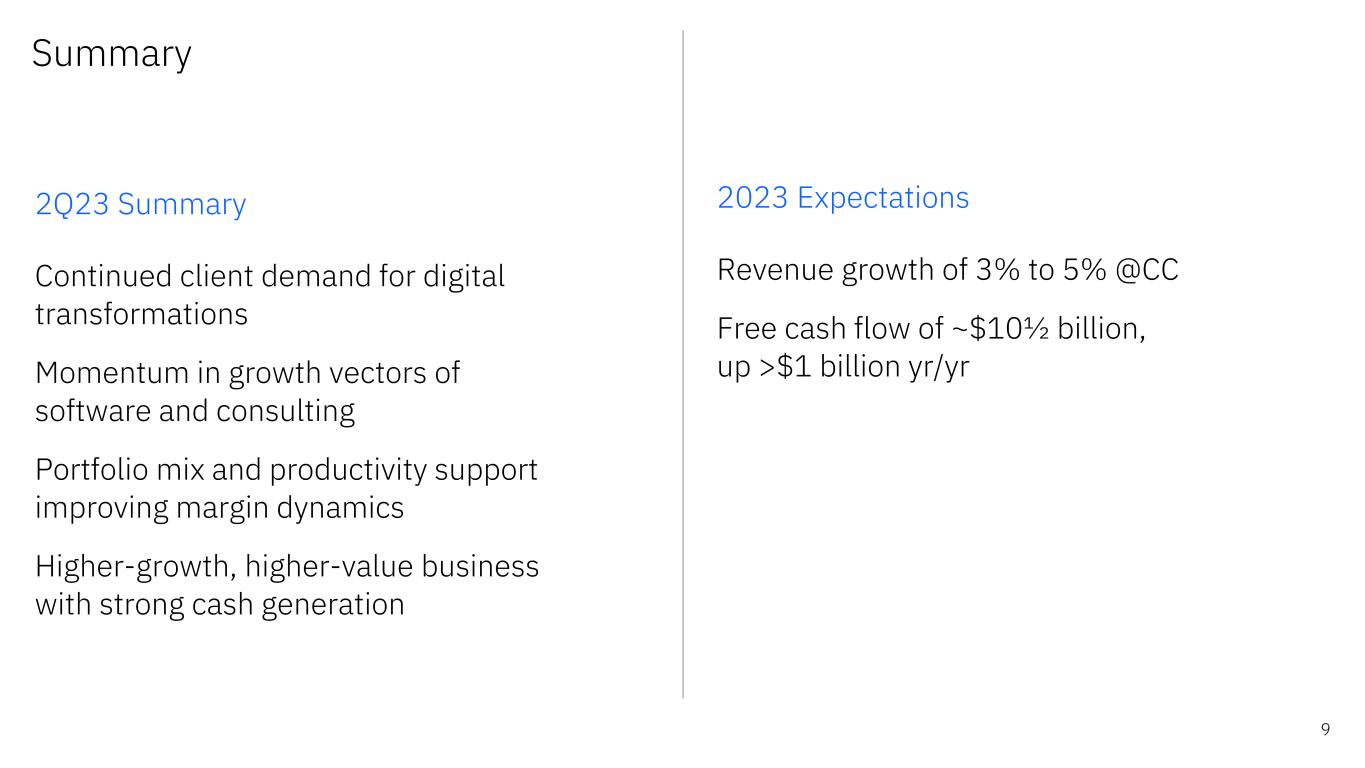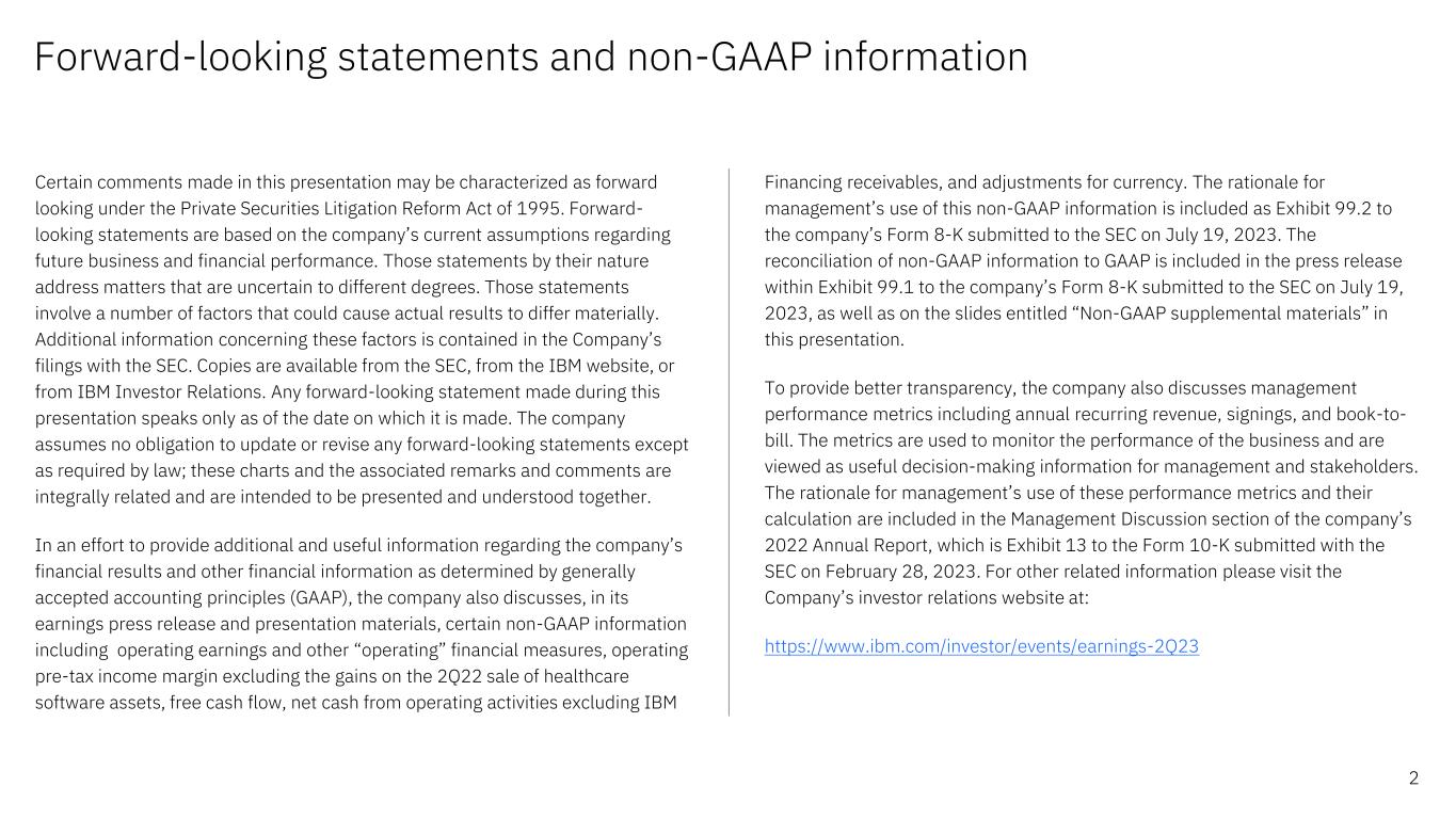 Forward-looking statements and non-GAAP information Certain comments made in this presentation may be characterized as forward looking under the Private Securities Litigation Reform Act of 1995. Forward- looking statements are based on the company’s current assumptions regarding future business and financial performance. Those statements by their nature address matters that are uncertain to different degrees. Those statements involve a number of factors that could cause actual results to differ materially. Additional information concerning these factors is contained in the Company’s filings with the SEC. Copies are available from the SEC, from the IBM website, or from IBM Investor Relations. Any forward-looking statement made during this presentation speaks only as of the date on which it is made. The company assumes no obligation to update or revise any forward-looking statements except as required by law; these charts and the associated remarks and comments are integrally related and are intended to be presented and understood together. In an effort to provide additional and useful information regarding the company’s financial results and other financial information as determined by generally accepted accounting principles (GAAP), the company also discusses, in its earnings press release and presentation materials, certain non-GAAP information including operating earnings and other “operating” financial measures, operating pre-tax income margin excluding the gains on the 2Q22 sale of healthcare software assets, free cash flow, net cash from operating activities excluding IBM Financing receivables, and adjustments for currency. The rationale for management’s use of this non-GAAP information is included as Exhibit 99.2 to the company’s Form 8-K submitted to the SEC on July 19, 2023. The reconciliation of non-GAAP information to GAAP is included in the press release within Exhibit 99.1 to the company’s Form 8-K submitted to the SEC on July 19, 2023, as well as on the slides entitled “Non-GAAP supplemental materials” in this presentation. To provide better transparency, the company also discusses management performance metrics including annual recurring revenue, signings, and book-to- bill. The metrics are used to monitor the performance of the business and are viewed as useful decision-making information for management and stakeholders. The rationale for management’s use of these performance metrics and their calculation are included in the Management Discussion section of the company’s 2022 Annual Report, which is Exhibit 13 to the Form 10-K submitted with the SEC on February 28, 2023. For other related information please visit the Company’s investor relations website at: https://www.ibm.com/investor/events/earnings-2Q23 2