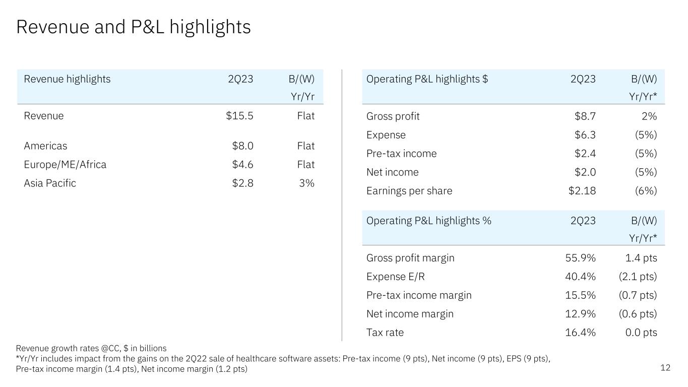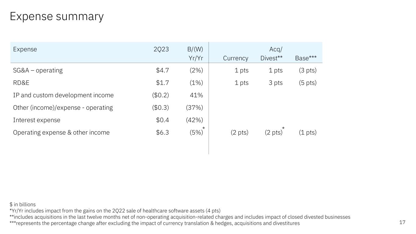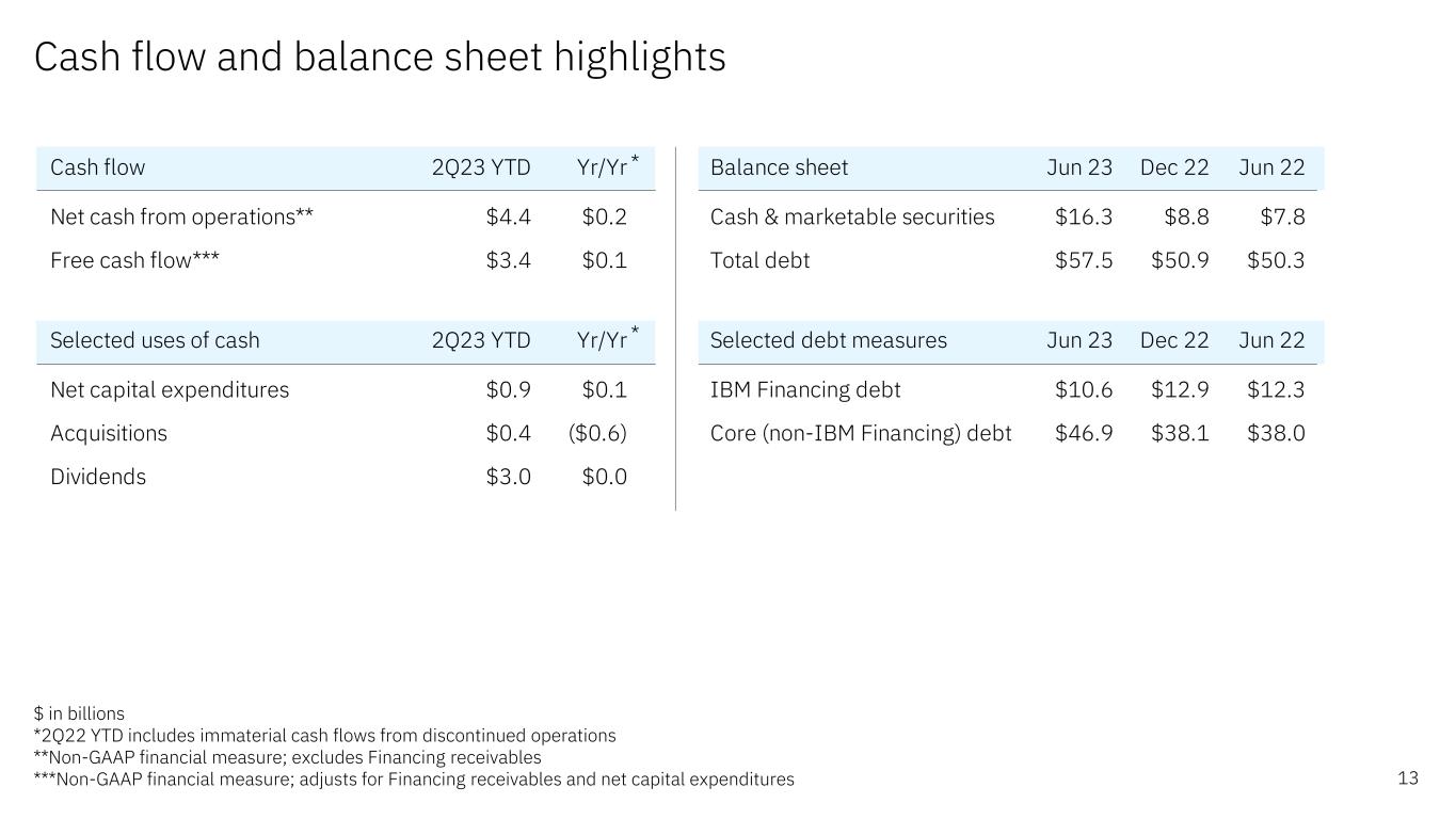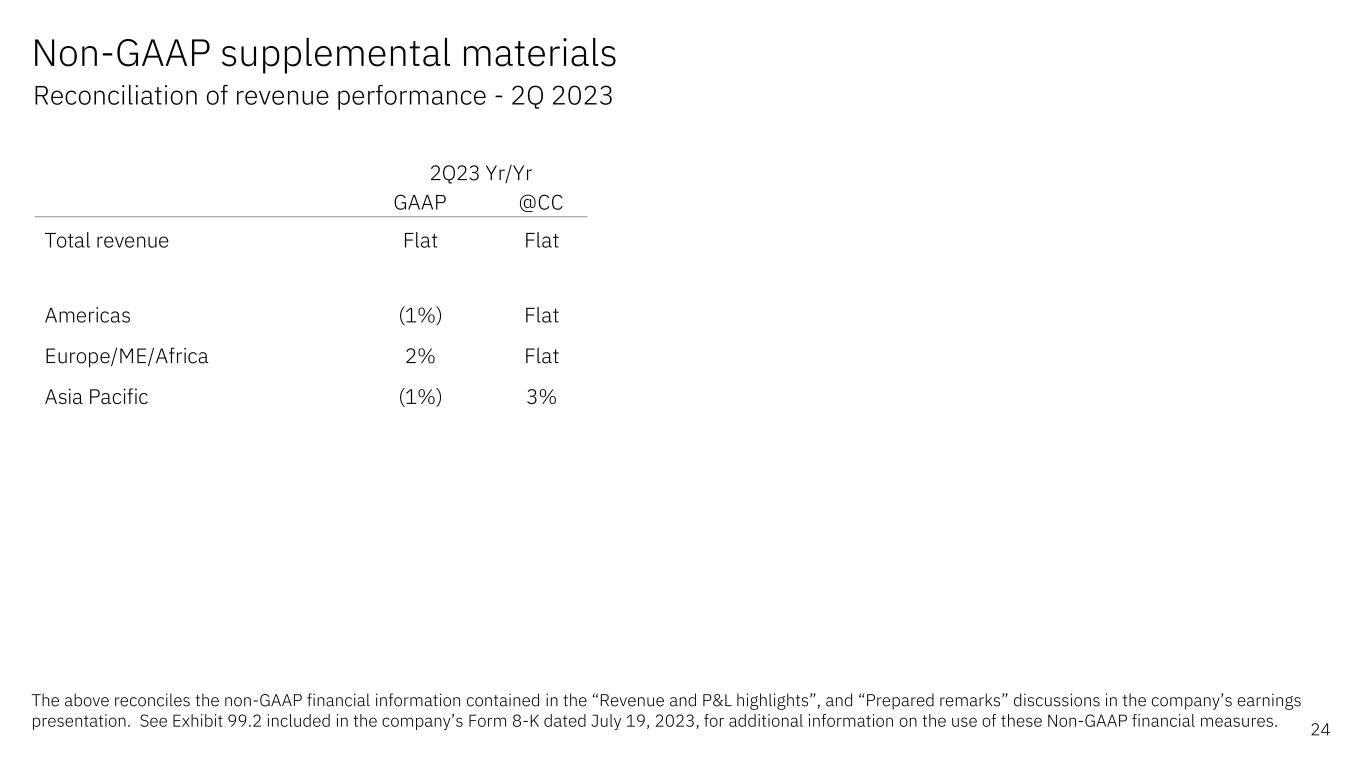 Forward-looking statements and non-GAAP information Certain comments made in this presentation may be characterized as forward looking under the Private Securities Litigation Reform Act of 1995. Forward- looking statements are based on the company’s current assumptions regarding future business and financial performance. Those statements by their nature address matters that are uncertain to different degrees. Those statements involve a number of factors that could cause actual results to differ materially. Additional information concerning these factors is contained in the Company’s filings with the SEC. Copies are available from the SEC, from the IBM website, or from IBM Investor Relations. Any forward-looking statement made during this presentation speaks only as of the date on which it is made. The company assumes no obligation to update or revise any forward-looking statements except as required by law; these charts and the associated remarks and comments are integrally related and are intended to be presented and understood together. In an effort to provide additional and useful information regarding the company’s financial results and other financial information as determined by generally accepted accounting principles (GAAP), the company also discusses, in its earnings press release and presentation materials, certain non-GAAP information including operating earnings and other “operating” financial measures, operating pre-tax income margin excluding the gains on the 2Q22 sale of healthcare software assets, free cash flow, net cash from operating activities excluding IBM Financing receivables, and adjustments for currency. The rationale for management’s use of this non-GAAP information is included as Exhibit 99.2 to the company’s Form 8-K submitted to the SEC on July 19, 2023. The reconciliation of non-GAAP information to GAAP is included in the press release within Exhibit 99.1 to the company’s Form 8-K submitted to the SEC on July 19, 2023, as well as on the slides entitled “Non-GAAP supplemental materials” in this presentation. To provide better transparency, the company also discusses management performance metrics including annual recurring revenue, signings, and book-to- bill. The metrics are used to monitor the performance of the business and are viewed as useful decision-making information for management and stakeholders. The rationale for management’s use of these performance metrics and their calculation are included in the Management Discussion section of the company’s 2022 Annual Report, which is Exhibit 13 to the Form 10-K submitted with the SEC on February 28, 2023. For other related information please visit the Company’s investor relations website at: https://www.ibm.com/investor/events/earnings-2Q23 2