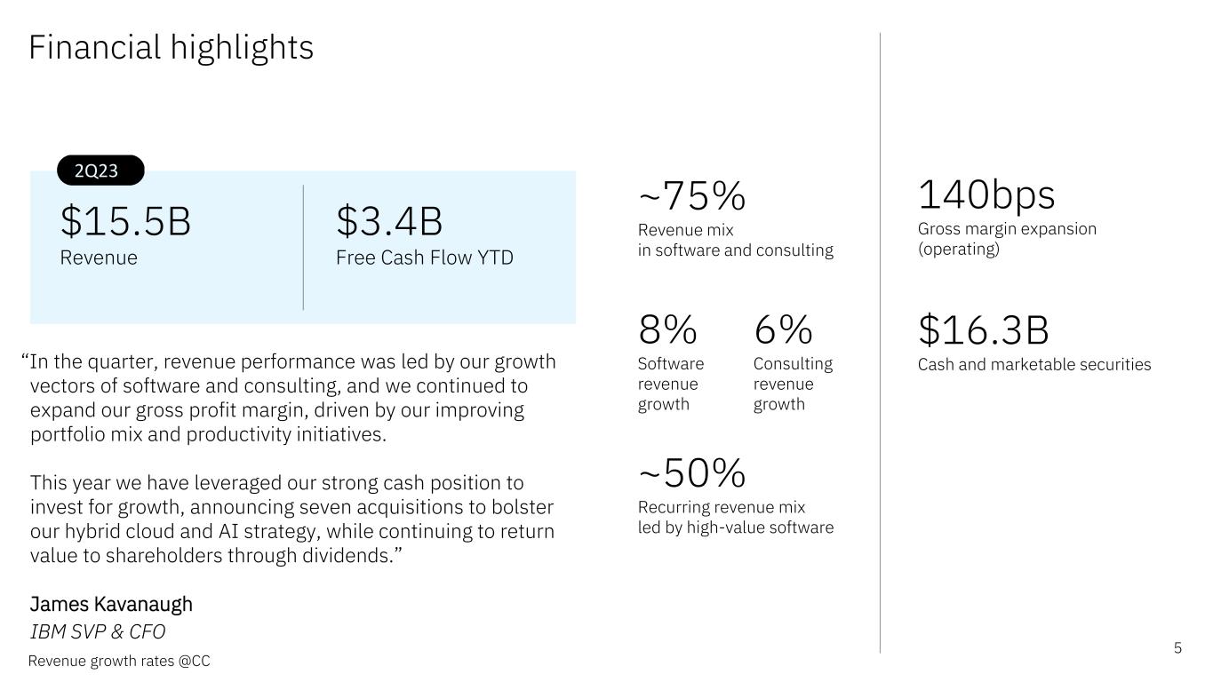 “Organizations are using our hybrid cloud and AI technology, and our consulting capabilities, to transform their operations. We continue to respond to the needs of our clients who seek trusted, enterprise AI solutions, and we are particularly excited about the response to the recently launched watsonx AI platform. Finally, we remain confident in our revenue and free cash flow growth expectations for the full year.” Arvind Krishna IBM Chairman and CEO 4 2Q23 Performance Clients, ecosystem and innovation Hybrid cloud and AI progress CEO perspective