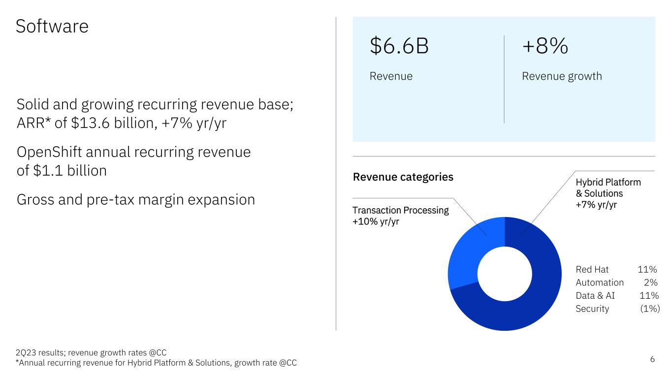 $15.5B Revenue $3.4B Free Cash Flow YTD 2Q23 Financial highlights Revenue growth rates @CC 5 “In the quarter, revenue performance was led by our growth vectors of software and consulting, and we continued to expand our gross profit margin, driven by our improving portfolio mix and productivity initiatives. This year we have leveraged our strong cash position to invest for growth, announcing seven acquisitions to bolster our hybrid cloud and AI strategy, while continuing to return value to shareholders through dividends.” James Kavanaugh IBM SVP & CFO ~75% Revenue mix in software and consulting ~50% Recurring revenue mix led by high-value software 140bps Gross margin expansion (operating) $16.3B Cash and marketable securities 8% Software revenue growth 6% Consulting revenue growth