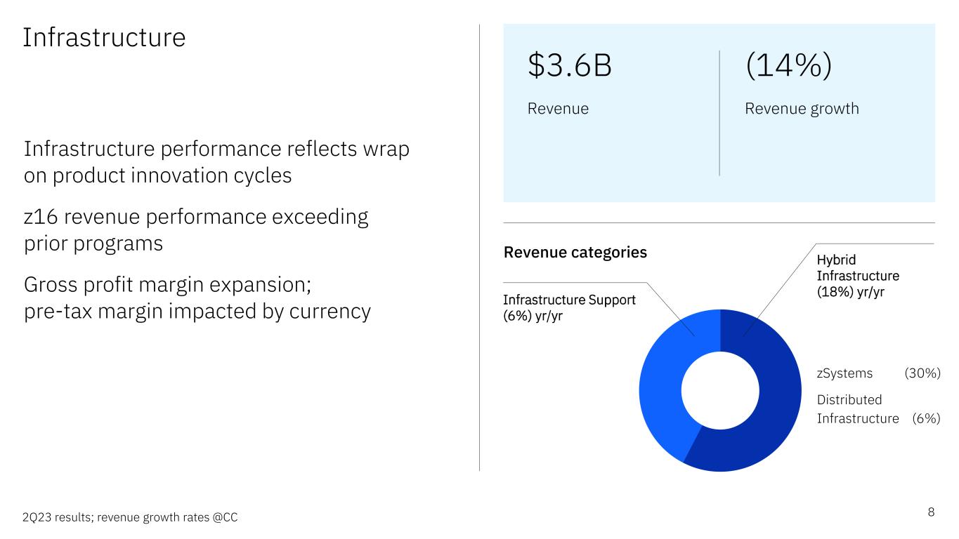 7 $5.0B Revenue Revenue categories Application Operations +8% yr/yr +6% Revenue growth Technology-driven transformations driving broad-based growth Red Hat and strategic partnerships continue double-digit growth Book-to-bill ratio of 1.1 for the last year Gross and pre-tax margin expansion Technology Consulting +5% yr/yr Business Transformation +5% yr/yr Consulting 2Q23 results; revenue growth rates @CC