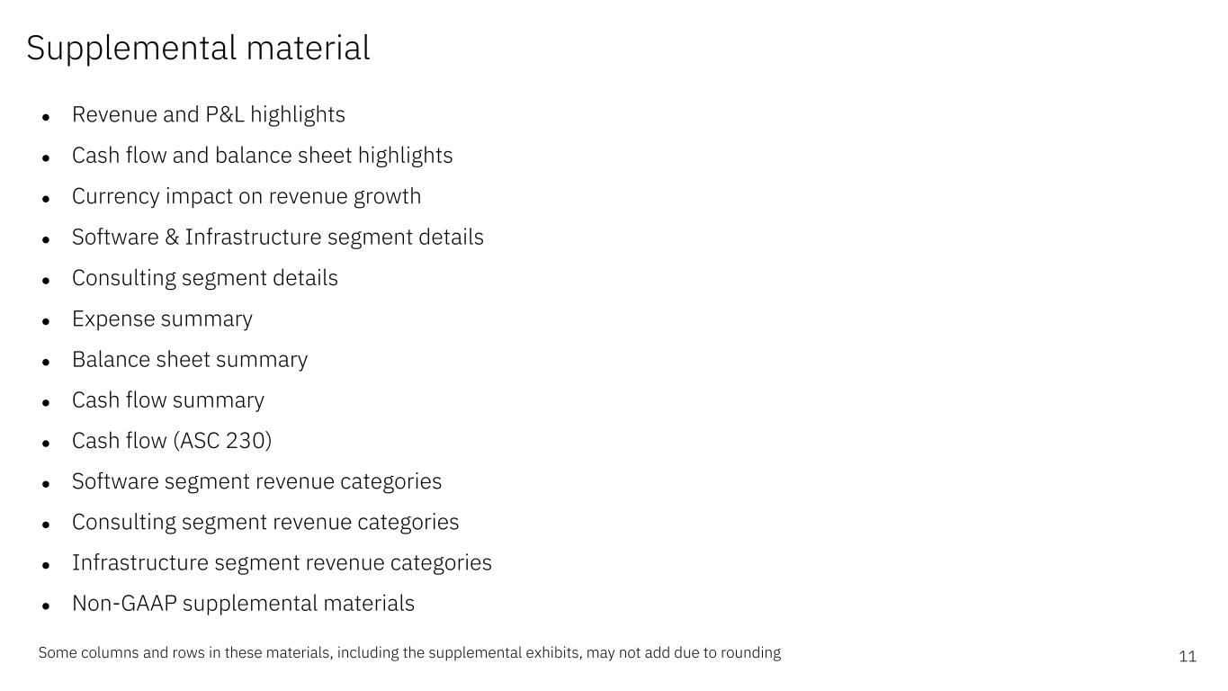 11 Supplemental material ● Revenue and P&L highlights ● Cash flow and balance sheet highlights ● Currency impact on revenue growth ● Software & Infrastructure segment details ● Consulting segment details ● Expense summary ● Balance sheet summary ● Cash flow summary ● Cash flow (ASC 230) ● Software segment revenue categories ● Consulting segment revenue categories ● Infrastructure segment revenue categories ● Non-GAAP supplemental materials Some columns and rows in these materials, including the supplemental exhibits, may not add due to rounding