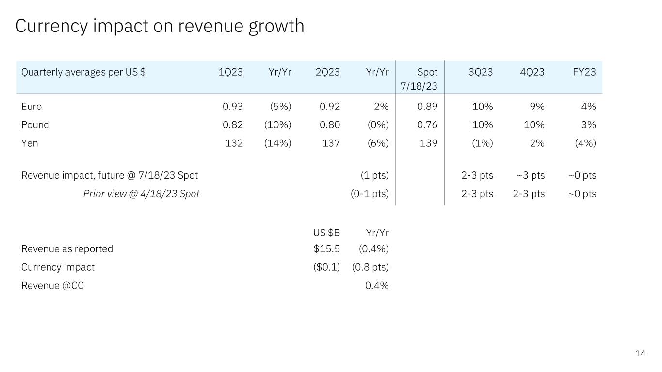 13 Cash flow and balance sheet highlights $ in billions *2Q22 YTD includes immaterial cash flows from discontinued operations **Non-GAAP financial measure; excludes Financing receivables ***Non-GAAP financial measure; adjusts for Financing receivables and net capital expenditures Balance sheet Jun 23 Dec 22 Jun 22 Cash & marketable securities $16.3 $8.8 $7.8 Total debt $57.5 $50.9 $50.3 Selected debt measures Jun 23 Dec 22 Jun 22 IBM Financing debt $10.6 $12.9 $12.3 Core (non-IBM Financing) debt $46.9 $38.1 $38.0 *Cash flow 2Q23 YTD Yr/Yr Net cash from operations** $4.4 $0.2 Free cash flow*** $3.4 $0.1 Selected uses of cash 2Q23 YTD Yr/Yr Net capital expenditures $0.9 $0.1 Acquisitions $0.4 ($0.6) Dividends $3.0 $0.0 *