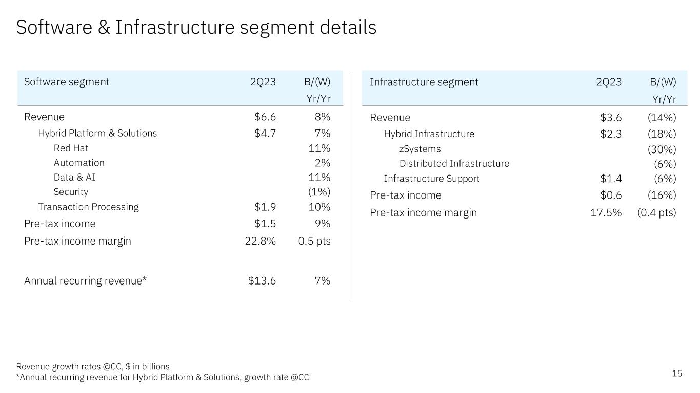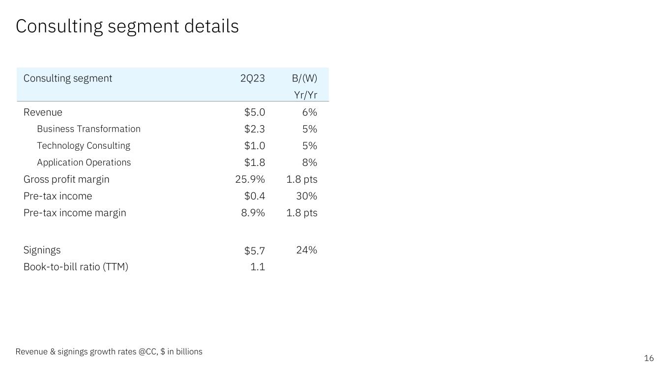 15 Software & Infrastructure segment details Revenue growth rates @CC, $ in billions *Annual recurring revenue for Hybrid Platform & Solutions, growth rate @CC Software segment 2Q23 B/(W) Yr/Yr Revenue $6.6 8% Hybrid Platform & Solutions $4.7 7% Red Hat 11% Automation 2% Data & AI 11% Security (1%) Transaction Processing $1.9 10% Pre-tax income $1.5 9% Pre-tax income margin 22.8% 0.5 pts Annual recurring revenue* $13.6 7% Infrastructure segment 2Q23 B/(W) Yr/Yr Revenue $3.6 (14%) Hybrid Infrastructure $2.3 (18%) zSystems (30%) Distributed Infrastructure (6%) Infrastructure Support $1.4 (6%) Pre-tax income $0.6 (16%) Pre-tax income margin 17.5% (0.4 pts)