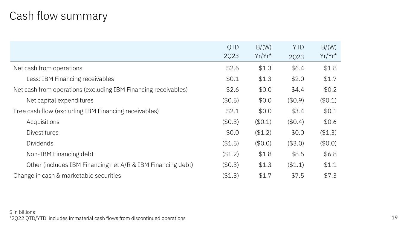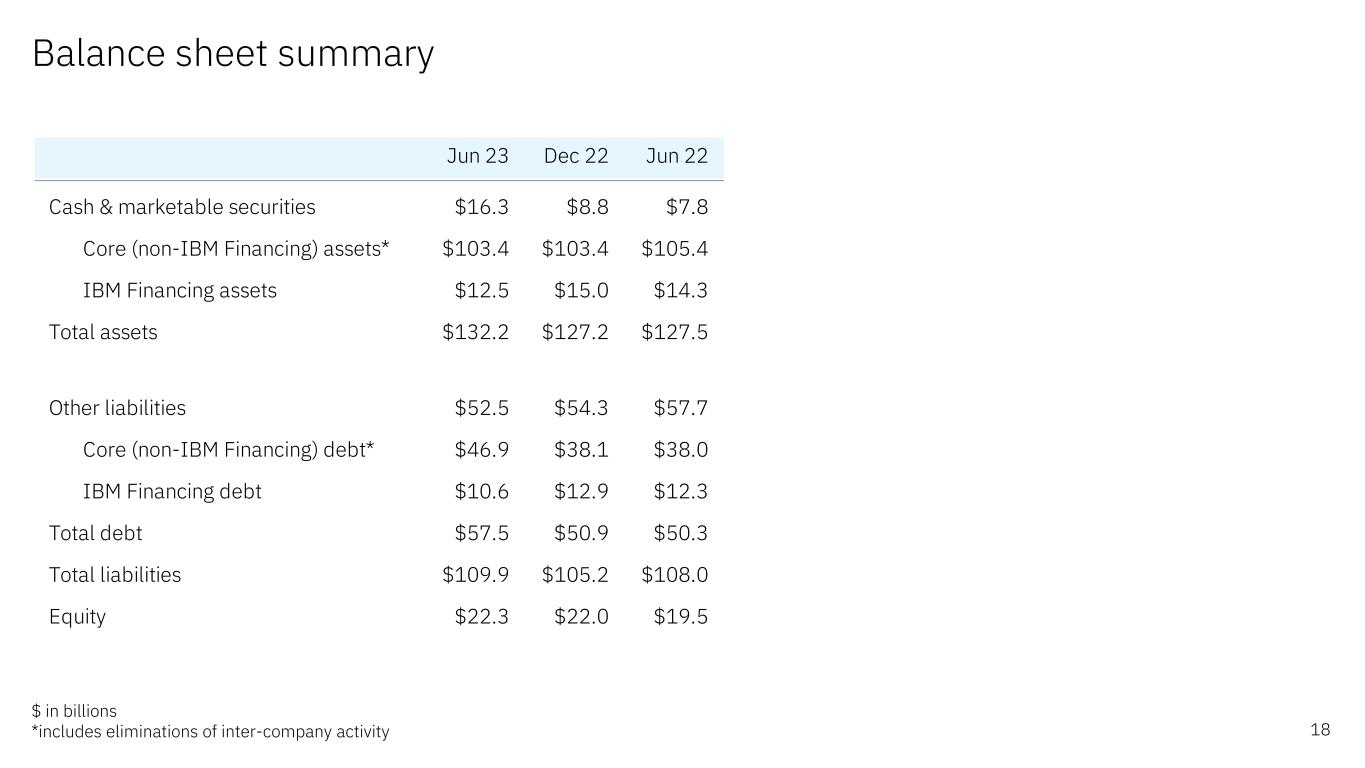 18 Balance sheet summary $ in billions *includes eliminations of inter-company activity Jun 23 Dec 22 Jun 22 Cash & marketable securities $16.3 $8.8 $7.8 Core (non-IBM Financing) assets* $103.4 $103.4 $105.4 IBM Financing assets $12.5 $15.0 $14.3 Total assets $132.2 $127.2 $127.5 Other liabilities $52.5 $54.3 $57.7 Core (non-IBM Financing) debt* $46.9 $38.1 $38.0 IBM Financing debt $10.6 $12.9 $12.3 Total debt $57.5 $50.9 $50.3 Total liabilities $109.9 $105.2 $108.0 Equity $22.3 $22.0 $19.5