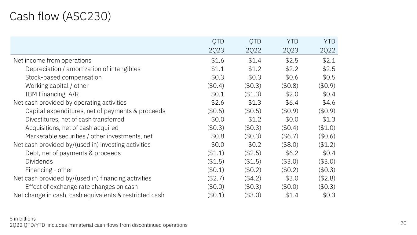 19 Cash flow summary $ in billions *2Q22 QTD/YTD includes immaterial cash flows from discontinued operations QTD B/(W) YTD B/(W) 2Q23 Yr/Yr* 2Q23 Yr/Yr* Net cash from operations $2.6 $1.3 $6.4 $1.8 Less: IBM Financing receivables $0.1 $1.3 $2.0 $1.7 Net cash from operations (excluding IBM Financing receivables) $2.6 $0.0 $4.4 $0.2 Net capital expenditures ($0.5) $0.0 ($0.9) ($0.1) Free cash flow (excluding IBM Financing receivables) $2.1 $0.0 $3.4 $0.1 Acquisitions ($0.3) ($0.1) ($0.4) $0.6 Divestitures $0.0 ($1.2) $0.0 ($1.3) Dividends ($1.5) ($0.0) ($3.0) ($0.0) Non-IBM Financing debt ($1.2) $1.8 $8.5 $6.8 Other (includes IBM Financing net A/R & IBM Financing debt) ($0.3) $1.3 ($1.1) $1.1 Change in cash & marketable securities ($1.3) $1.7 $7.5 $7.3