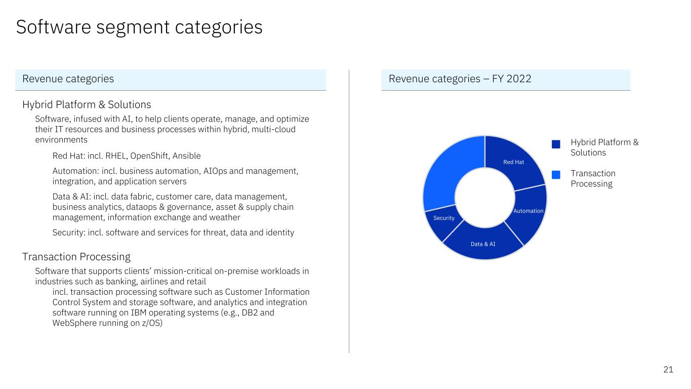 21 Software segment categories Revenue categories – FY 2022Revenue categories Red Hat Automation Data & AI Security Hybrid Platform & Solutions Transaction Processing Hybrid Platform & Solutions Software, infused with AI, to help clients operate, manage, and optimize their IT resources and business processes within hybrid, multi-cloud environments Red Hat: incl. RHEL, OpenShift, Ansible Automation: incl. business automation, AIOps and management, integration, and application servers Data & AI: incl. data fabric, customer care, data management, business analytics, dataops & governance, asset & supply chain management, information exchange and weather Security: incl. software and services for threat, data and identity Transaction Processing Software that supports clients’ mission-critical on-premise workloads in industries such as banking, airlines and retail incl. transaction processing software such as Customer Information Control System and storage software, and analytics and integration software running on IBM operating systems (e.g., DB2 and WebSphere running on z/OS)