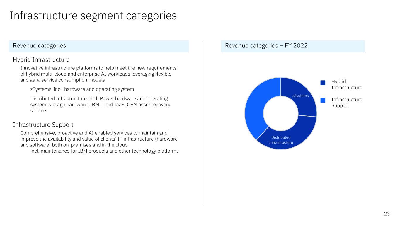 22 Consulting segment categories Revenue categories Business Transformation Technology Consulting Application Operations Revenue categories – FY 2022 Business Transformation Strategy, process design, system implementation and operations services to improve and transform key business processes. Deploys AI and automation in business processes to exploit the value of data and includes an ecosystem of partners alongside IBM technology, which includes strategic partnerships with Adobe, Oracle, Salesforce and SAP, among others Technology Consulting Skills to architect and implement cloud platforms, including Amazon, Microsoft and IBM, and strategies to transform the enterprise experience and enable innovation, including application modernization for hybrid cloud with Red Hat OpenShift Application Operations Application and cloud platform services required to operationalize and run cloud platforms. Facilitates clients’ efforts to manage, optimize and orchestrate application and data workloads across platforms and environments through both custom applications and ISV packages