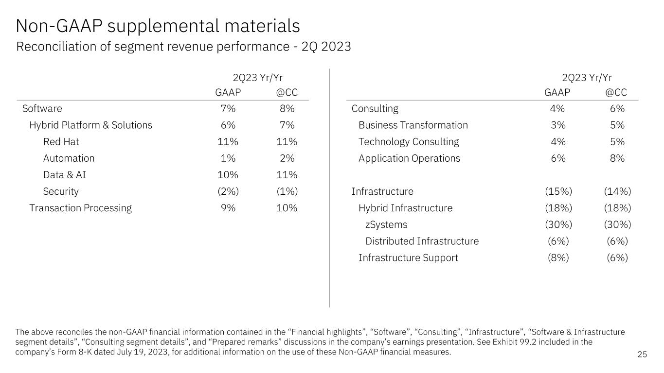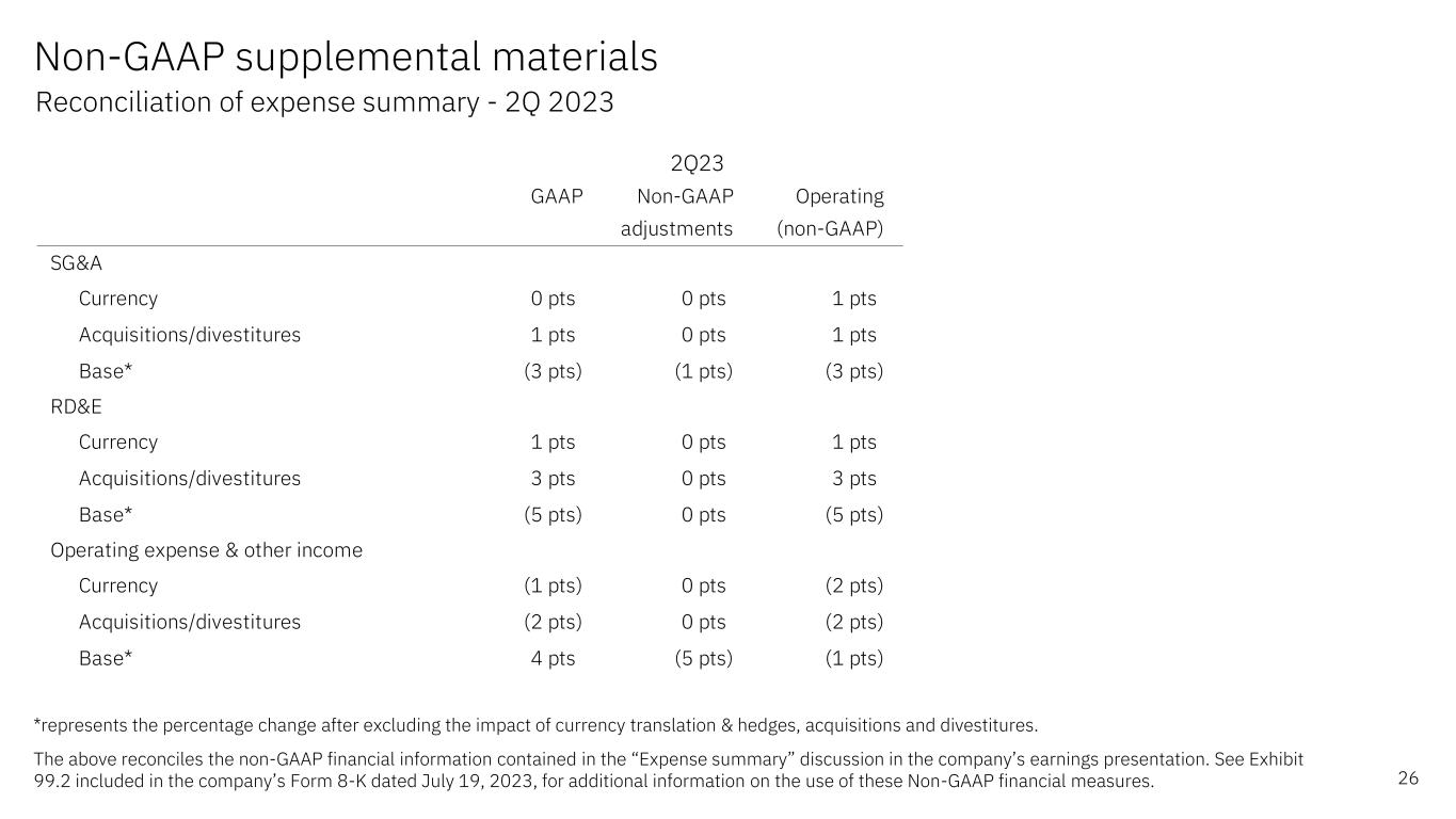 25 Non-GAAP supplemental materials The above reconciles the non-GAAP financial information contained in the “Financial highlights”, “Software”, “Consulting”, “Infrastructure”, “Software & Infrastructure segment details”, “Consulting segment details”, and “Prepared remarks” discussions in the company’s earnings presentation. See Exhibit 99.2 included in the company’s Form 8-K dated July 19, 2023, for additional information on the use of these Non-GAAP financial measures. Reconciliation of segment revenue performance - 2Q 2023 GAAP @CC Software 7% 8% Hybrid Platform & Solutions 6% 7% Red Hat 11% 11% Automation 1% 2% Data & AI 10% 11% Security (2%) (1%) Transaction Processing 9% 10% 2Q23 Yr/Yr GAAP @CC Consulting 4% 6% Business Transformation 3% 5% Technology Consulting 4% 5% Application Operations 6% 8% Infrastructure (15%) (14%) Hybrid Infrastructure (18%) (18%) zSystems (30%) (30%) Distributed Infrastructure (6%) (6%) Infrastructure Support (8%) (6%) 2Q23 Yr/Yr