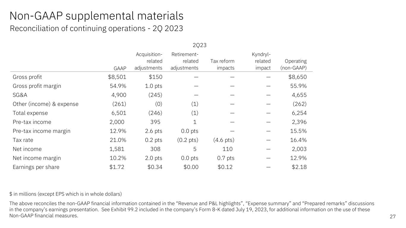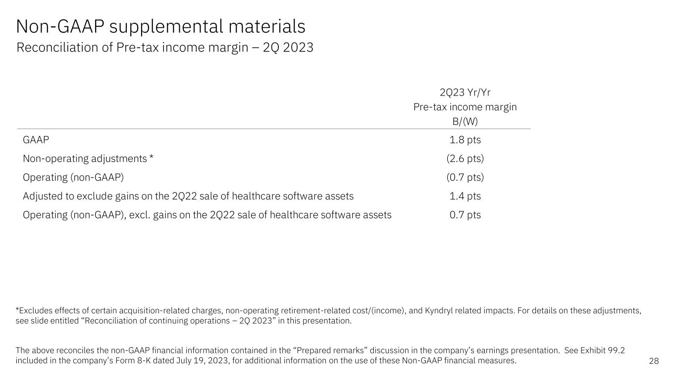 27 Non-GAAP supplemental materials $ in millions (except EPS which is in whole dollars) The above reconciles the non-GAAP financial information contained in the “Revenue and P&L highlights”, “Expense summary” and “Prepared remarks” discussions in the company’s earnings presentation. See Exhibit 99.2 included in the company’s Form 8-K dated July 19, 2023, for additional information on the use of these Non-GAAP financial measures. Reconciliation of continuing operations - 2Q 2023 GAAP Acquisition- related adjustments Retirement- related adjustments Tax reform impacts Kyndryl- related impact Operating (non-GAAP) Gross profit $8,501 $150 — — — $8,650 Gross profit margin 54.9% 1.0 pts — — — 55.9% SG&A 4,900 (245) — — — 4,655 Other (income) & expense (261) (0) (1) — — (262) Total expense  6,501 (246) (1) — — 6,254 Pre-tax income 2,000 395 1 — — 2,396 Pre-tax income margin 12.9% 2.6 pts 0.0 pts — — 15.5% Tax rate 21.0% 0.2 pts (0.2 pts) (4.6 pts) — 16.4% Net income 1,581 308 5 110 — 2,003 Net income margin 10.2% 2.0 pts 0.0 pts 0.7 pts — 12.9% Earnings per share $1.72 $0.34 $0.00 $0.12 — $2.18 2Q23