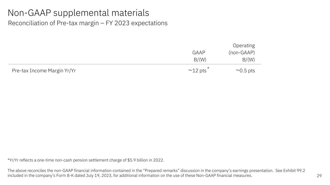 28 Non-GAAP supplemental materials *Excludes effects of certain acquisition-related charges, non-operating retirement-related cost/(income), and Kyndryl related impacts. For details on these adjustments, see slide entitled “Reconciliation of continuing operations – 2Q 2023” in this presentation. The above reconciles the non-GAAP financial information contained in the “Prepared remarks” discussion in the company’s earnings presentation. See Exhibit 99.2 included in the company’s Form 8-K dated July 19, 2023, for additional information on the use of these Non-GAAP financial measures. Reconciliation of Pre-tax income margin – 2Q 2023 2Q23 Yr/Yr Pre-tax income margin B/(W) GAAP 1.8 pts Non-operating adjustments * (2.6 pts) Operating (non-GAAP) (0.7 pts) Adjusted to exclude gains on the 2Q22 sale of healthcare software assets 1.4 pts Operating (non-GAAP), excl. gains on the 2Q22 sale of healthcare software assets 0.7 pts