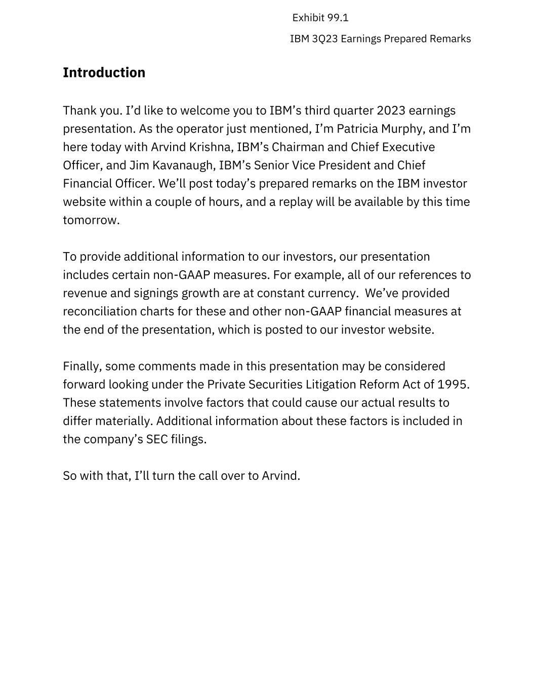 IBM 3Q23 Earnings Prepared Remarks Introduction Thank you. I’d like to welcome you to IBM’s third quarter 2023 earnings presentation. As the operator just mentioned, I’m Patricia Murphy, and I’m here today with Arvind Krishna, IBM’s Chairman and Chief Executive Officer, and Jim Kavanaugh, IBM’s Senior Vice President and Chief Financial Officer. We’ll post today’s prepared remarks on the IBM investor website within a couple of hours, and a replay will be available by this time tomorrow. To provide additional information to our investors, our presentation includes certain non-GAAP measures. For example, all of our references to revenue and signings growth are at constant currency. We’ve provided reconciliation charts for these and other non-GAAP financial measures at the end of the presentation, which is posted to our investor website. Finally, some comments made in this presentation may be considered forward looking under the Private Securities Litigation Reform Act of 1995. These statements involve factors that could cause our actual results to differ materially. Additional information about these factors is included in the company’s SEC filings. So with that, I’ll turn the call over to Arvind. Exhibit 99.1