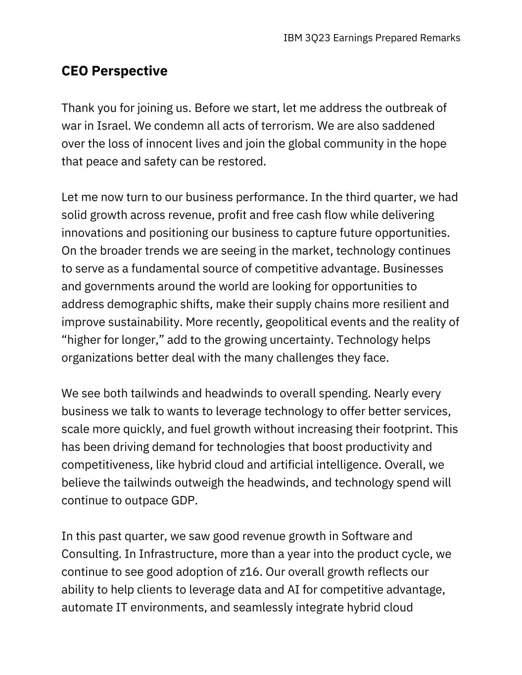 IBM 3Q23 Earnings Prepared Remarks CEO Perspective Thank you for joining us. Before we start, let me address the outbreak of war in Israel. We condemn all acts of terrorism. We are also saddened over the loss of innocent lives and join the global community in the hope that peace and safety can be restored. Let me now turn to our business performance. In the third quarter, we had solid growth across revenue, profit and free cash flow while delivering innovations and positioning our business to capture future opportunities. On the broader trends we are seeing in the market, technology continues to serve as a fundamental source of competitive advantage. Businesses and governments around the world are looking for opportunities to address demographic shifts, make their supply chains more resilient and improve sustainability. More recently, geopolitical events and the reality of “higher for longer,” add to the growing uncertainty. Technology helps organizations better deal with the many challenges they face. We see both tailwinds and headwinds to overall spending. Nearly every business we talk to wants to leverage technology to offer better services, scale more quickly, and fuel growth without increasing their footprint. This has been driving demand for technologies that boost productivity and competitiveness, like hybrid cloud and artificial intelligence. Overall, we believe the tailwinds outweigh the headwinds, and technology spend will continue to outpace GDP. In this past quarter, we saw good revenue growth in Software and Consulting. In Infrastructure, more than a year into the product cycle, we continue to see good adoption of z16. Our overall growth reflects our ability to help clients to leverage data and AI for competitive advantage, automate IT environments, and seamlessly integrate hybrid cloud
