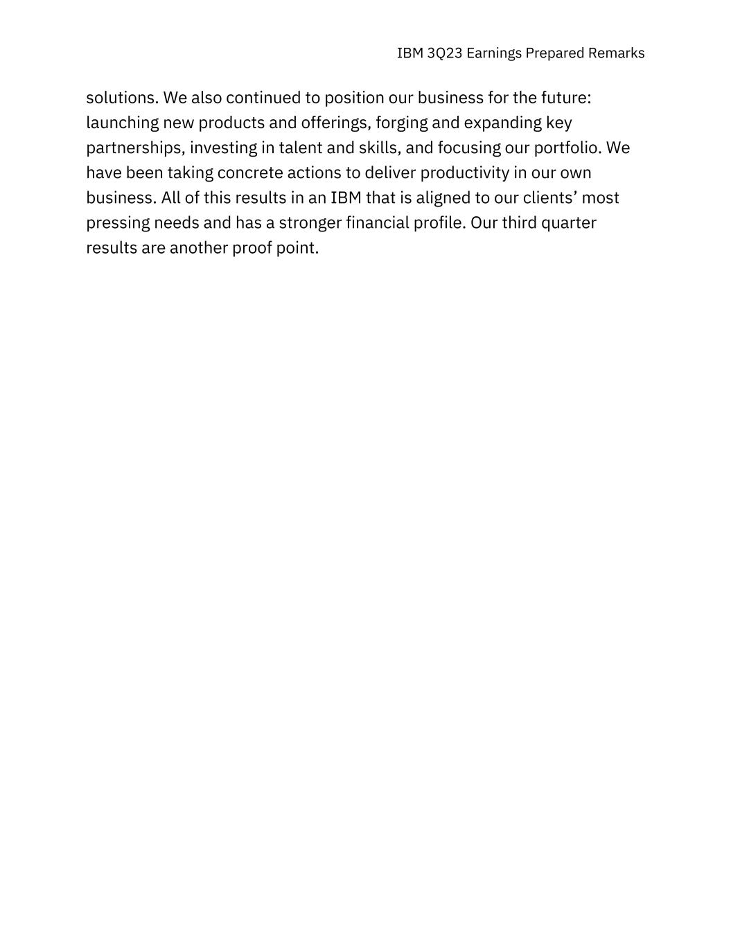 IBM 3Q23 Earnings Prepared Remarks solutions. We also continued to position our business for the future: launching new products and offerings, forging and expanding key partnerships, investing in talent and skills, and focusing our portfolio. We have been taking concrete actions to deliver productivity in our own business. All of this results in an IBM that is aligned to our clients’ most pressing needs and has a stronger financial profile. Our third quarter results are another proof point.