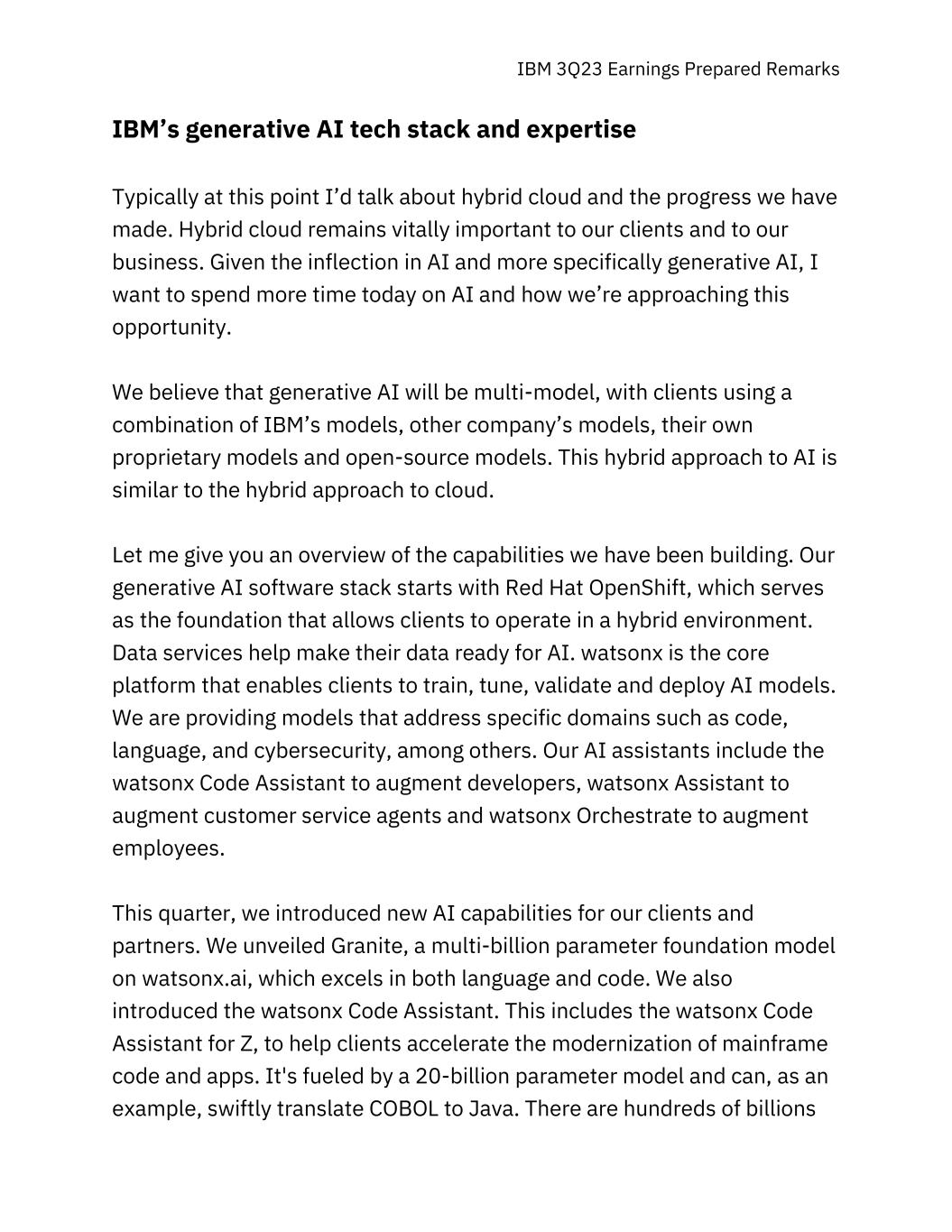 IBM 3Q23 Earnings Prepared Remarks IBM’s generative AI tech stack and expertise Typically at this point I’d talk about hybrid cloud and the progress we have made. Hybrid cloud remains vitally important to our clients and to our business. Given the inflection in AI and more specifically generative AI, I want to spend more time today on AI and how we’re approaching this opportunity. We believe that generative AI will be multi-model, with clients using a combination of IBM’s models, other company’s models, their own proprietary models and open-source models. This hybrid approach to AI is similar to the hybrid approach to cloud. Let me give you an overview of the capabilities we have been building. Our generative AI software stack starts with Red Hat OpenShift, which serves as the foundation that allows clients to operate in a hybrid environment. Data services help make their data ready for AI. watsonx is the core platform that enables clients to train, tune, validate and deploy AI models. We are providing models that address specific domains such as code, language, and cybersecurity, among others. Our AI assistants include the watsonx Code Assistant to augment developers, watsonx Assistant to augment customer service agents and watsonx Orchestrate to augment employees. This quarter, we introduced new AI capabilities for our clients and partners. We unveiled Granite, a multi-billion parameter foundation model on watsonx.ai, which excels in both language and code. We also introduced the watsonx Code Assistant. This includes the watsonx Code Assistant for Z, to help clients accelerate the modernization of mainframe code and apps. It's fueled by a 20-billion parameter model and can, as an example, swiftly translate COBOL to Java. There are hundreds of billions