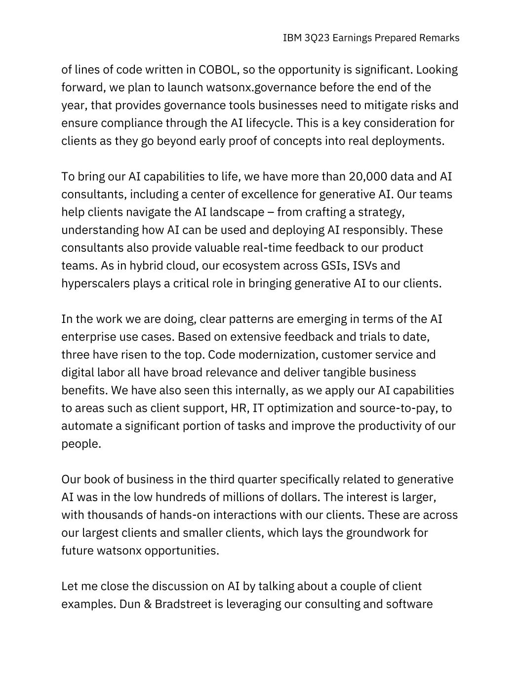 IBM 3Q23 Earnings Prepared Remarks of lines of code written in COBOL, so the opportunity is significant. Looking forward, we plan to launch watsonx.governance before the end of the year, that provides governance tools businesses need to mitigate risks and ensure compliance through the AI lifecycle. This is a key consideration for clients as they go beyond early proof of concepts into real deployments. To bring our AI capabilities to life, we have more than 20,000 data and AI consultants, including a center of excellence for generative AI. Our teams help clients navigate the AI landscape – from crafting a strategy, understanding how AI can be used and deploying AI responsibly. These consultants also provide valuable real-time feedback to our product teams. As in hybrid cloud, our ecosystem across GSIs, ISVs and hyperscalers plays a critical role in bringing generative AI to our clients. In the work we are doing, clear patterns are emerging in terms of the AI enterprise use cases. Based on extensive feedback and trials to date, three have risen to the top. Code modernization, customer service and digital labor all have broad relevance and deliver tangible business benefits. We have also seen this internally, as we apply our AI capabilities to areas such as client support, HR, IT optimization and source-to-pay, to automate a significant portion of tasks and improve the productivity of our people. Our book of business in the third quarter specifically related to generative AI was in the low hundreds of millions of dollars. The interest is larger, with thousands of hands-on interactions with our clients. These are across our largest clients and smaller clients, which lays the groundwork for future watsonx opportunities. Let me close the discussion on AI by talking about a couple of client examples. Dun & Bradstreet is leveraging our consulting and software