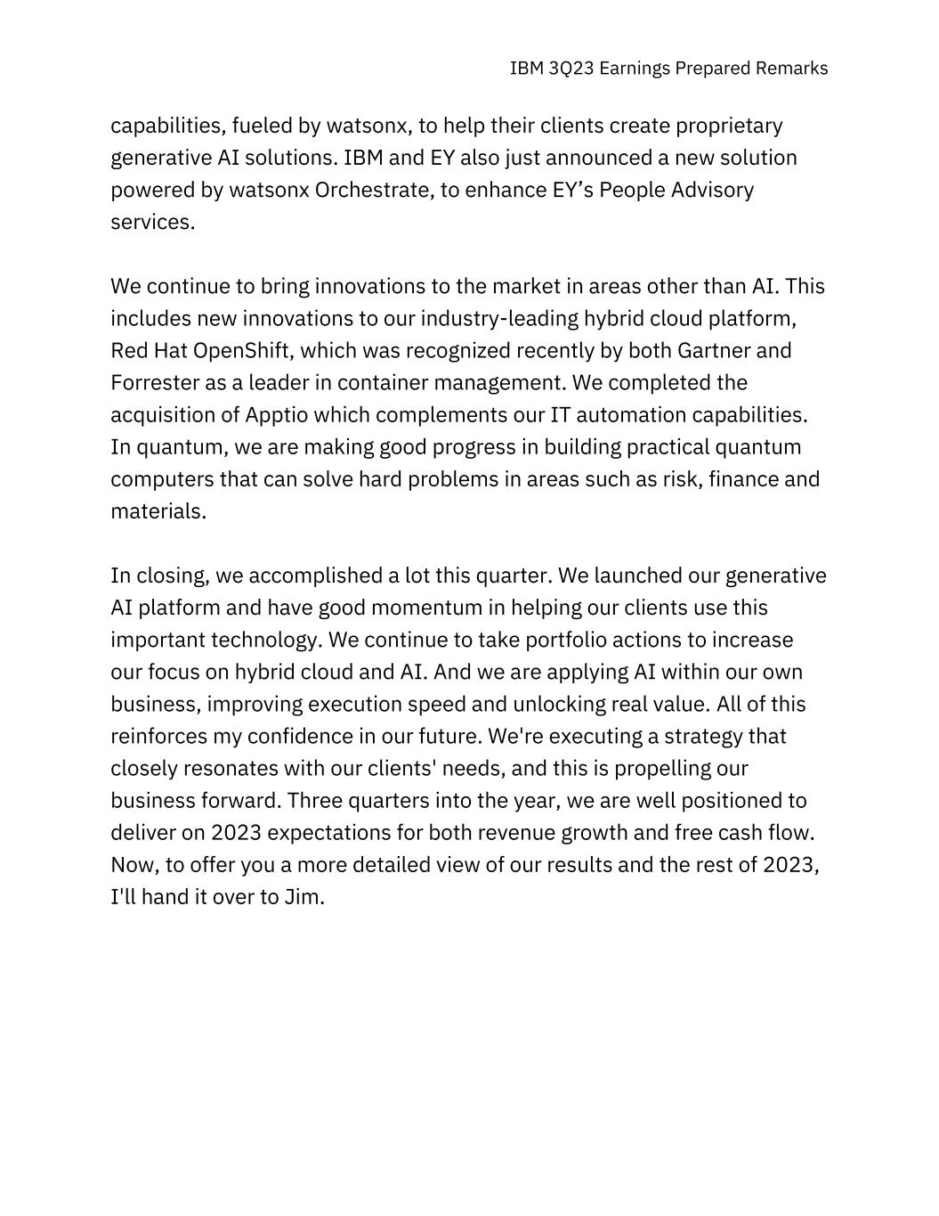 IBM 3Q23 Earnings Prepared Remarks capabilities, fueled by watsonx, to help their clients create proprietary generative AI solutions. IBM and EY also just announced a new solution powered by watsonx Orchestrate, to enhance EY’s People Advisory services. We continue to bring innovations to the market in areas other than AI. This includes new innovations to our industry-leading hybrid cloud platform, Red Hat OpenShift, which was recognized recently by both Gartner and Forrester as a leader in container management. We completed the acquisition of Apptio which complements our IT automation capabilities. In quantum, we are making good progress in building practical quantum computers that can solve hard problems in areas such as risk, finance and materials. In closing, we accomplished a lot this quarter. We launched our generative AI platform and have good momentum in helping our clients use this important technology. We continue to take portfolio actions to increase our focus on hybrid cloud and AI. And we are applying AI within our own business, improving execution speed and unlocking real value. All of this reinforces my confidence in our future. We're executing a strategy that closely resonates with our clients' needs, and this is propelling our business forward. Three quarters into the year, we are well positioned to deliver on 2023 expectations for both revenue growth and free cash flow. Now, to offer you a more detailed view of our results and the rest of 2023, I'll hand it over to Jim.