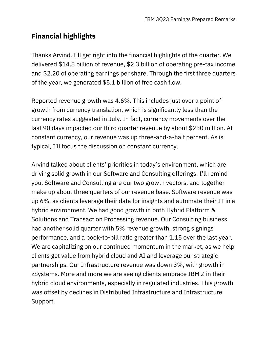 IBM 3Q23 Earnings Prepared Remarks Financial highlights Thanks Arvind. I’ll get right into the financial highlights of the quarter. We delivered $14.8 billion of revenue, $2.3 billion of operating pre-tax income and $2.20 of operating earnings per share. Through the first three quarters of the year, we generated $5.1 billion of free cash flow. Reported revenue growth was 4.6%. This includes just over a point of growth from currency translation, which is significantly less than the currency rates suggested in July. In fact, currency movements over the last 90 days impacted our third quarter revenue by about $250 million. At constant currency, our revenue was up three-and-a-half percent. As is typical, I’ll focus the discussion on constant currency. Arvind talked about clients’ priorities in today’s environment, which are driving solid growth in our Software and Consulting offerings. I’ll remind you, Software and Consulting are our two growth vectors, and together make up about three quarters of our revenue base. Software revenue was up 6%, as clients leverage their data for insights and automate their IT in a hybrid environment. We had good growth in both Hybrid Platform & Solutions and Transaction Processing revenue. Our Consulting business had another solid quarter with 5% revenue growth, strong signings performance, and a book-to-bill ratio greater than 1.15 over the last year. We are capitalizing on our continued momentum in the market, as we help clients get value from hybrid cloud and AI and leverage our strategic partnerships. Our Infrastructure revenue was down 3%, with growth in zSystems. More and more we are seeing clients embrace IBM Z in their hybrid cloud environments, especially in regulated industries. This growth was offset by declines in Distributed Infrastructure and Infrastructure Support.