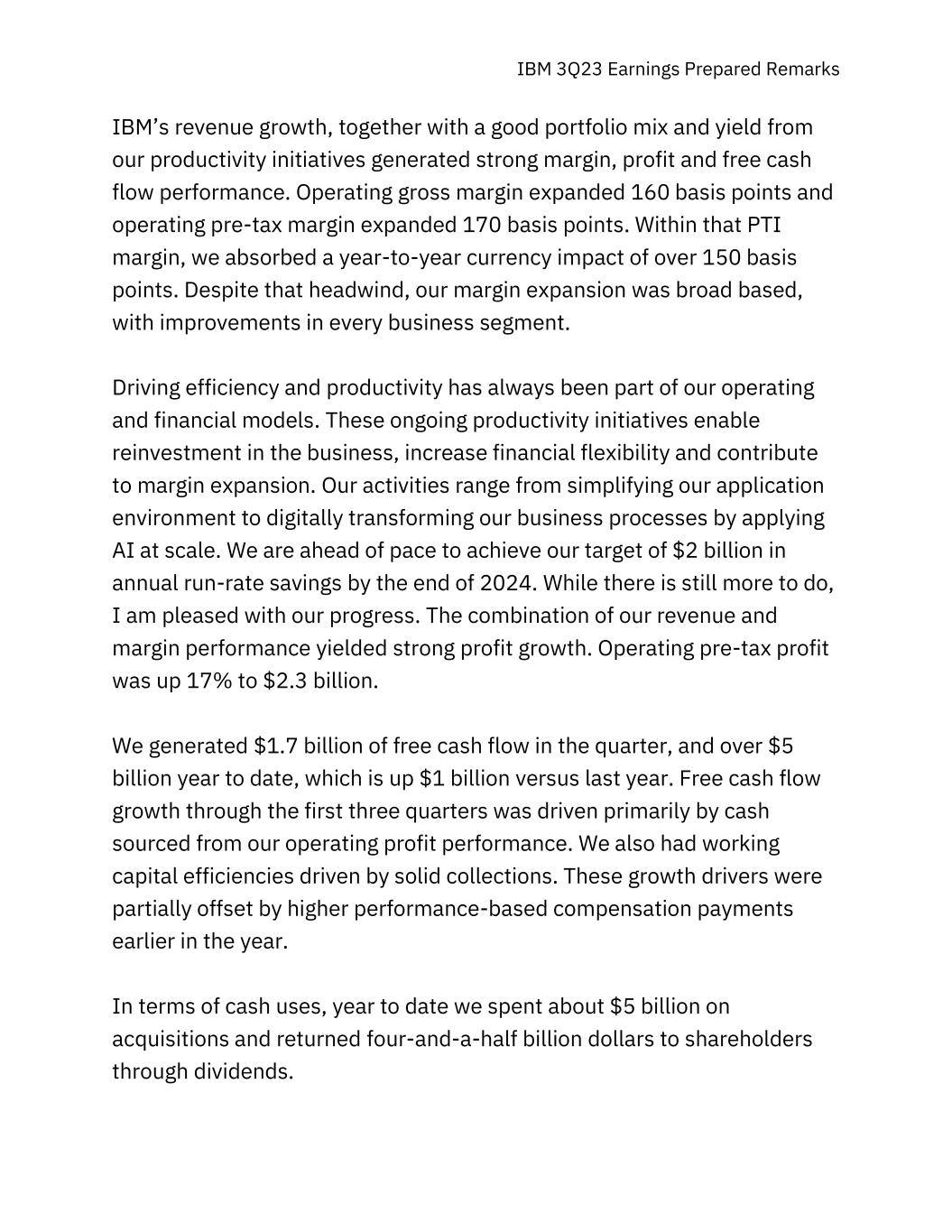 IBM 3Q23 Earnings Prepared Remarks IBM’s revenue growth, together with a good portfolio mix and yield from our productivity initiatives generated strong margin, profit and free cash flow performance. Operating gross margin expanded 160 basis points and operating pre-tax margin expanded 170 basis points. Within that PTI margin, we absorbed a year-to-year currency impact of over 150 basis points. Despite that headwind, our margin expansion was broad based, with improvements in every business segment. Driving efficiency and productivity has always been part of our operating and financial models. These ongoing productivity initiatives enable reinvestment in the business, increase financial flexibility and contribute to margin expansion. Our activities range from simplifying our application environment to digitally transforming our business processes by applying AI at scale. We are ahead of pace to achieve our target of $2 billion in annual run-rate savings by the end of 2024. While there is still more to do, I am pleased with our progress. The combination of our revenue and margin performance yielded strong profit growth. Operating pre-tax profit was up 17% to $2.3 billion. We generated $1.7 billion of free cash flow in the quarter, and over $5 billion year to date, which is up $1 billion versus last year. Free cash flow growth through the first three quarters was driven primarily by cash sourced from our operating profit performance. We also had working capital efficiencies driven by solid collections. These growth drivers were partially offset by higher performance-based compensation payments earlier in the year. In terms of cash uses, year to date we spent about $5 billion on acquisitions and returned four-and-a-half billion dollars to shareholders through dividends.