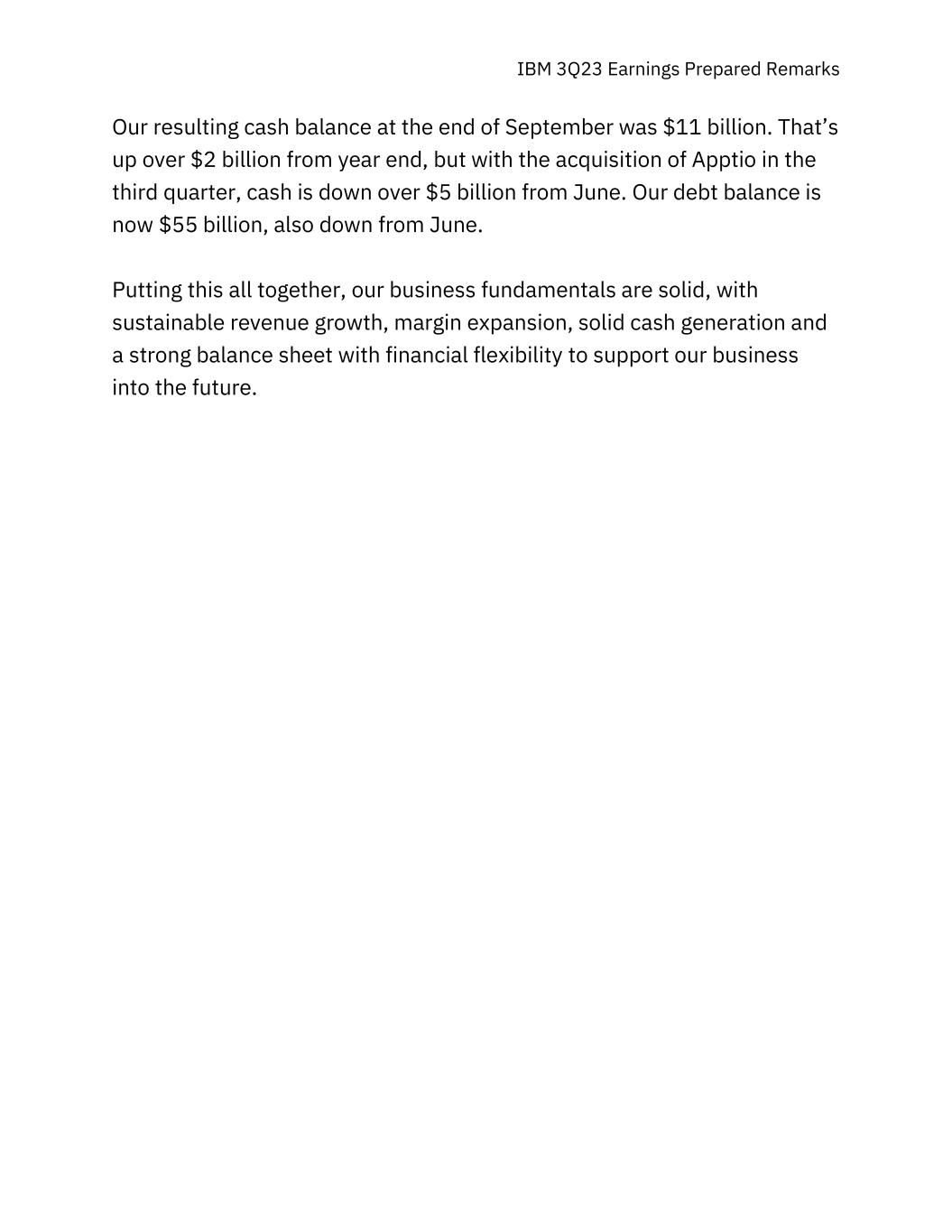 IBM 3Q23 Earnings Prepared Remarks Our resulting cash balance at the end of September was $11 billion. That’s up over $2 billion from year end, but with the acquisition of Apptio in the third quarter, cash is down over $5 billion from June. Our debt balance is now $55 billion, also down from June. Putting this all together, our business fundamentals are solid, with sustainable revenue growth, margin expansion, solid cash generation and a strong balance sheet with financial flexibility to support our business into the future.