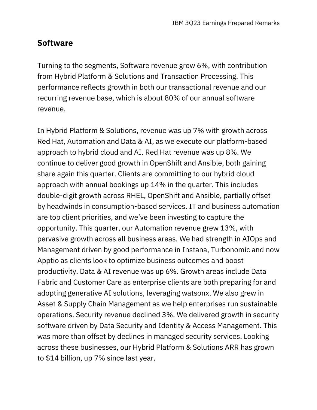 IBM 3Q23 Earnings Prepared Remarks Software Turning to the segments, Software revenue grew 6%, with contribution from Hybrid Platform & Solutions and Transaction Processing. This performance reflects growth in both our transactional revenue and our recurring revenue base, which is about 80% of our annual software revenue. In Hybrid Platform & Solutions, revenue was up 7% with growth across Red Hat, Automation and Data & AI, as we execute our platform-based approach to hybrid cloud and AI. Red Hat revenue was up 8%. We continue to deliver good growth in OpenShift and Ansible, both gaining share again this quarter. Clients are committing to our hybrid cloud approach with annual bookings up 14% in the quarter. This includes double-digit growth across RHEL, OpenShift and Ansible, partially offset by headwinds in consumption-based services. IT and business automation are top client priorities, and we’ve been investing to capture the opportunity. This quarter, our Automation revenue grew 13%, with pervasive growth across all business areas. We had strength in AIOps and Management driven by good performance in Instana, Turbonomic and now Apptio as clients look to optimize business outcomes and boost productivity. Data & AI revenue was up 6%. Growth areas include Data Fabric and Customer Care as enterprise clients are both preparing for and adopting generative AI solutions, leveraging watsonx. We also grew in Asset & Supply Chain Management as we help enterprises run sustainable operations. Security revenue declined 3%. We delivered growth in security software driven by Data Security and Identity & Access Management. This was more than offset by declines in managed security services. Looking across these businesses, our Hybrid Platform & Solutions ARR has grown to $14 billion, up 7% since last year.