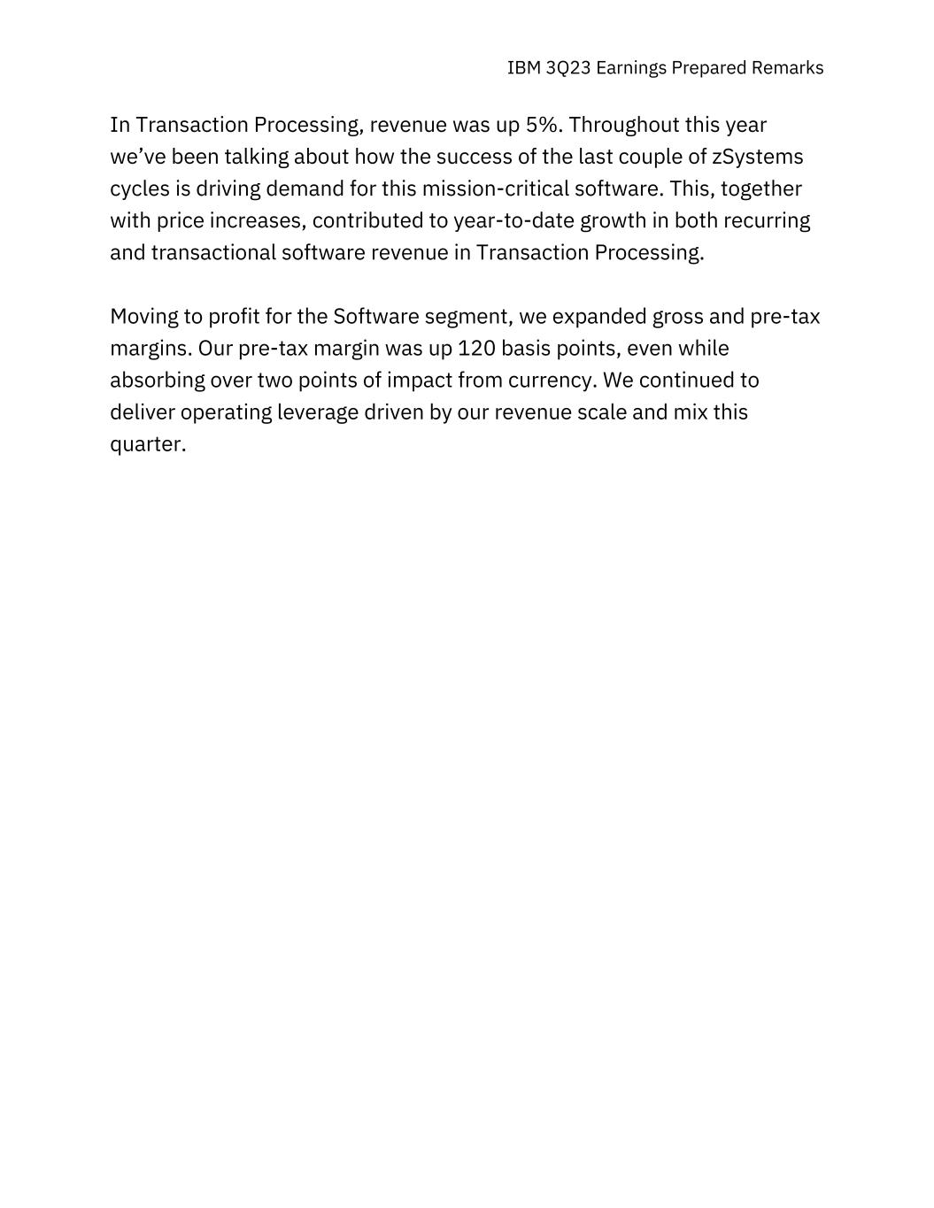 IBM 3Q23 Earnings Prepared Remarks In Transaction Processing, revenue was up 5%. Throughout this year we’ve been talking about how the success of the last couple of zSystems cycles is driving demand for this mission-critical software. This, together with price increases, contributed to year-to-date growth in both recurring and transactional software revenue in Transaction Processing. Moving to profit for the Software segment, we expanded gross and pre-tax margins. Our pre-tax margin was up 120 basis points, even while absorbing over two points of impact from currency. We continued to deliver operating leverage driven by our revenue scale and mix this quarter.