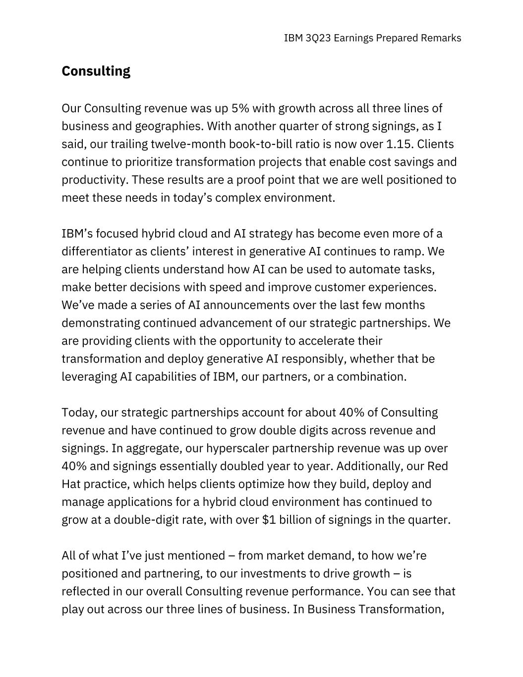 IBM 3Q23 Earnings Prepared Remarks Consulting Our Consulting revenue was up 5% with growth across all three lines of business and geographies. With another quarter of strong signings, as I said, our trailing twelve-month book-to-bill ratio is now over 1.15. Clients continue to prioritize transformation projects that enable cost savings and productivity. These results are a proof point that we are well positioned to meet these needs in today’s complex environment. IBM’s focused hybrid cloud and AI strategy has become even more of a differentiator as clients’ interest in generative AI continues to ramp. We are helping clients understand how AI can be used to automate tasks, make better decisions with speed and improve customer experiences. We’ve made a series of AI announcements over the last few months demonstrating continued advancement of our strategic partnerships. We are providing clients with the opportunity to accelerate their transformation and deploy generative AI responsibly, whether that be leveraging AI capabilities of IBM, our partners, or a combination. Today, our strategic partnerships account for about 40% of Consulting revenue and have continued to grow double digits across revenue and signings. In aggregate, our hyperscaler partnership revenue was up over 40% and signings essentially doubled year to year. Additionally, our Red Hat practice, which helps clients optimize how they build, deploy and manage applications for a hybrid cloud environment has continued to grow at a double-digit rate, with over $1 billion of signings in the quarter. All of what I’ve just mentioned – from market demand, to how we’re positioned and partnering, to our investments to drive growth – is reflected in our overall Consulting revenue performance. You can see that play out across our three lines of business. In Business Transformation,