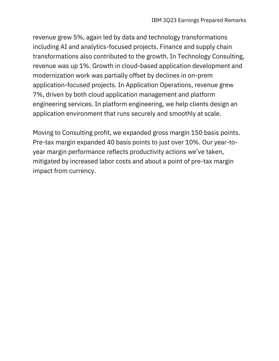 IBM 3Q23 Earnings Prepared Remarks revenue grew 5%, again led by data and technology transformations including AI and analytics-focused projects. Finance and supply chain transformations also contributed to the growth. In Technology Consulting, revenue was up 1%. Growth in cloud-based application development and modernization work was partially offset by declines in on-prem application-focused projects. In Application Operations, revenue grew 7%, driven by both cloud application management and platform engineering services. In platform engineering, we help clients design an application environment that runs securely and smoothly at scale. Moving to Consulting profit, we expanded gross margin 150 basis points. Pre-tax margin expanded 40 basis points to just over 10%. Our year-to- year margin performance reflects productivity actions we’ve taken, mitigated by increased labor costs and about a point of pre-tax margin impact from currency.