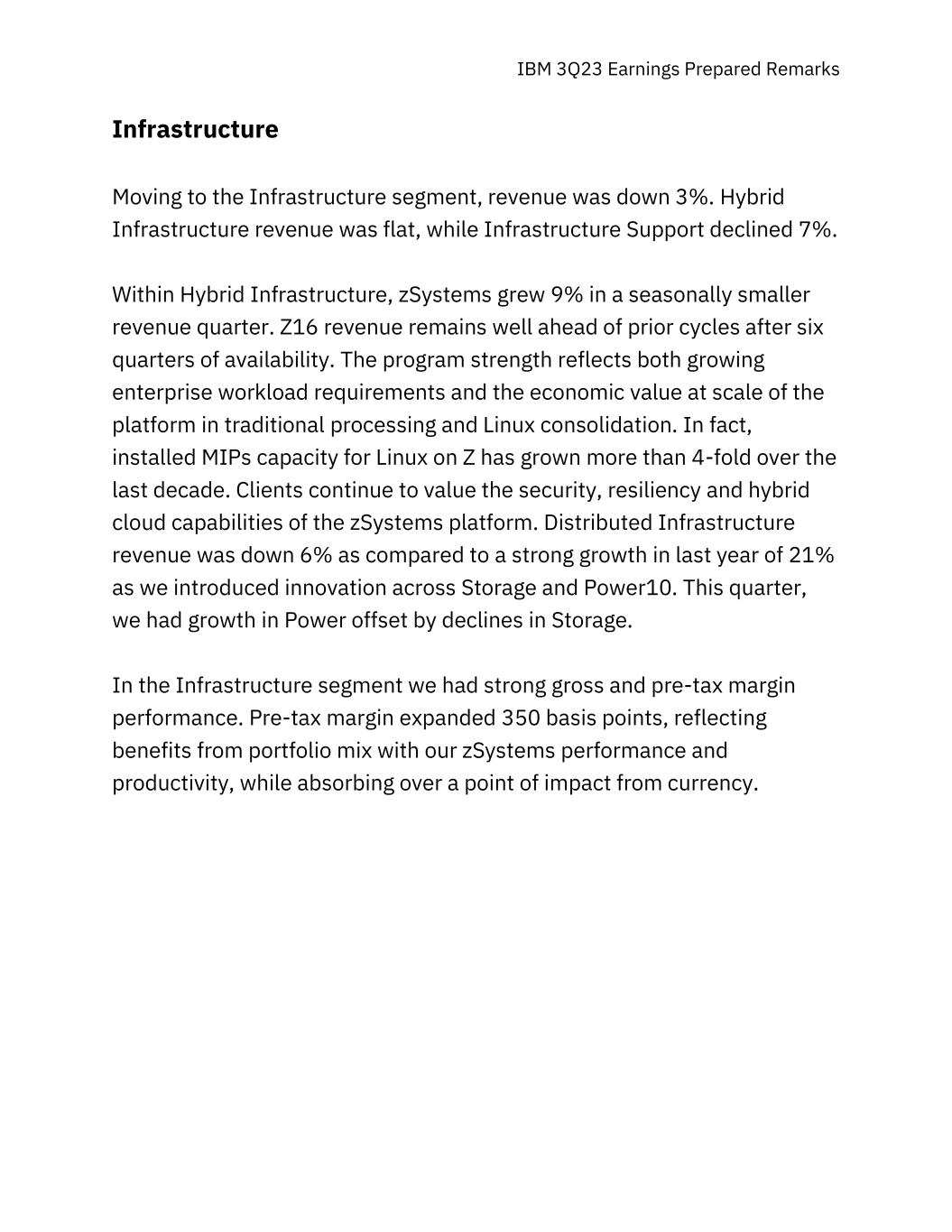 IBM 3Q23 Earnings Prepared Remarks Infrastructure Moving to the Infrastructure segment, revenue was down 3%. Hybrid Infrastructure revenue was flat, while Infrastructure Support declined 7%. Within Hybrid Infrastructure, zSystems grew 9% in a seasonally smaller revenue quarter. Z16 revenue remains well ahead of prior cycles after six quarters of availability. The program strength reflects both growing enterprise workload requirements and the economic value at scale of the platform in traditional processing and Linux consolidation. In fact, installed MIPs capacity for Linux on Z has grown more than 4-fold over the last decade. Clients continue to value the security, resiliency and hybrid cloud capabilities of the zSystems platform. Distributed Infrastructure revenue was down 6% as compared to a strong growth in last year of 21% as we introduced innovation across Storage and Power10. This quarter, we had growth in Power offset by declines in Storage. In the Infrastructure segment we had strong gross and pre-tax margin performance. Pre-tax margin expanded 350 basis points, reflecting benefits from portfolio mix with our zSystems performance and productivity, while absorbing over a point of impact from currency.