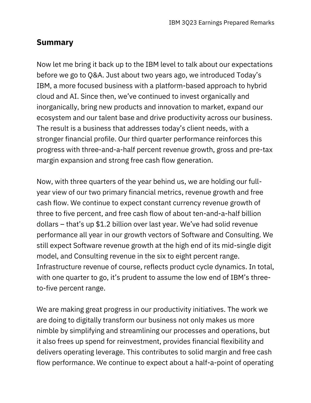 IBM 3Q23 Earnings Prepared Remarks Summary Now let me bring it back up to the IBM level to talk about our expectations before we go to Q&A. Just about two years ago, we introduced Today’s IBM, a more focused business with a platform-based approach to hybrid cloud and AI. Since then, we’ve continued to invest organically and inorganically, bring new products and innovation to market, expand our ecosystem and our talent base and drive productivity across our business. The result is a business that addresses today’s client needs, with a stronger financial profile. Our third quarter performance reinforces this progress with three-and-a-half percent revenue growth, gross and pre-tax margin expansion and strong free cash flow generation. Now, with three quarters of the year behind us, we are holding our full- year view of our two primary financial metrics, revenue growth and free cash flow. We continue to expect constant currency revenue growth of three to five percent, and free cash flow of about ten-and-a-half billion dollars – that’s up $1.2 billion over last year. We’ve had solid revenue performance all year in our growth vectors of Software and Consulting. We still expect Software revenue growth at the high end of its mid-single digit model, and Consulting revenue in the six to eight percent range. Infrastructure revenue of course, reflects product cycle dynamics. In total, with one quarter to go, it’s prudent to assume the low end of IBM’s three- to-five percent range. We are making great progress in our productivity initiatives. The work we are doing to digitally transform our business not only makes us more nimble by simplifying and streamlining our processes and operations, but it also frees up spend for reinvestment, provides financial flexibility and delivers operating leverage. This contributes to solid margin and free cash flow performance. We continue to expect about a half-a-point of operating