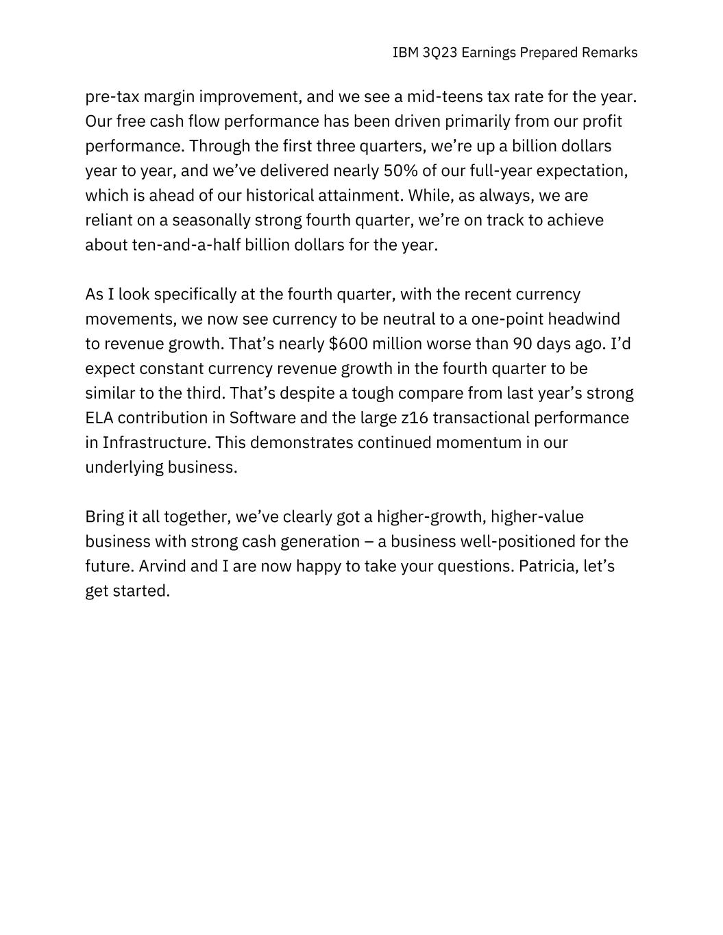 IBM 3Q23 Earnings Prepared Remarks pre-tax margin improvement, and we see a mid-teens tax rate for the year. Our free cash flow performance has been driven primarily from our profit performance. Through the first three quarters, we’re up a billion dollars year to year, and we’ve delivered nearly 50% of our full-year expectation, which is ahead of our historical attainment. While, as always, we are reliant on a seasonally strong fourth quarter, we’re on track to achieve about ten-and-a-half billion dollars for the year. As I look specifically at the fourth quarter, with the recent currency movements, we now see currency to be neutral to a one-point headwind to revenue growth. That’s nearly $600 million worse than 90 days ago. I’d expect constant currency revenue growth in the fourth quarter to be similar to the third. That’s despite a tough compare from last year’s strong ELA contribution in Software and the large z16 transactional performance in Infrastructure. This demonstrates continued momentum in our underlying business. Bring it all together, we’ve clearly got a higher-growth, higher-value business with strong cash generation – a business well-positioned for the future. Arvind and I are now happy to take your questions. Patricia, let’s get started.