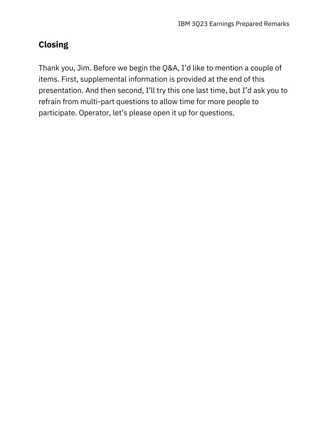 IBM 3Q23 Earnings Prepared Remarks Closing Thank you, Jim. Before we begin the Q&A, I’d like to mention a couple of items. First, supplemental information is provided at the end of this presentation. And then second, I’ll try this one last time, but I’d ask you to refrain from multi-part questions to allow time for more people to participate. Operator, let’s please open it up for questions.