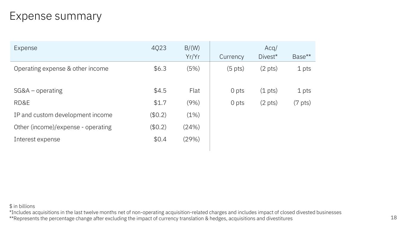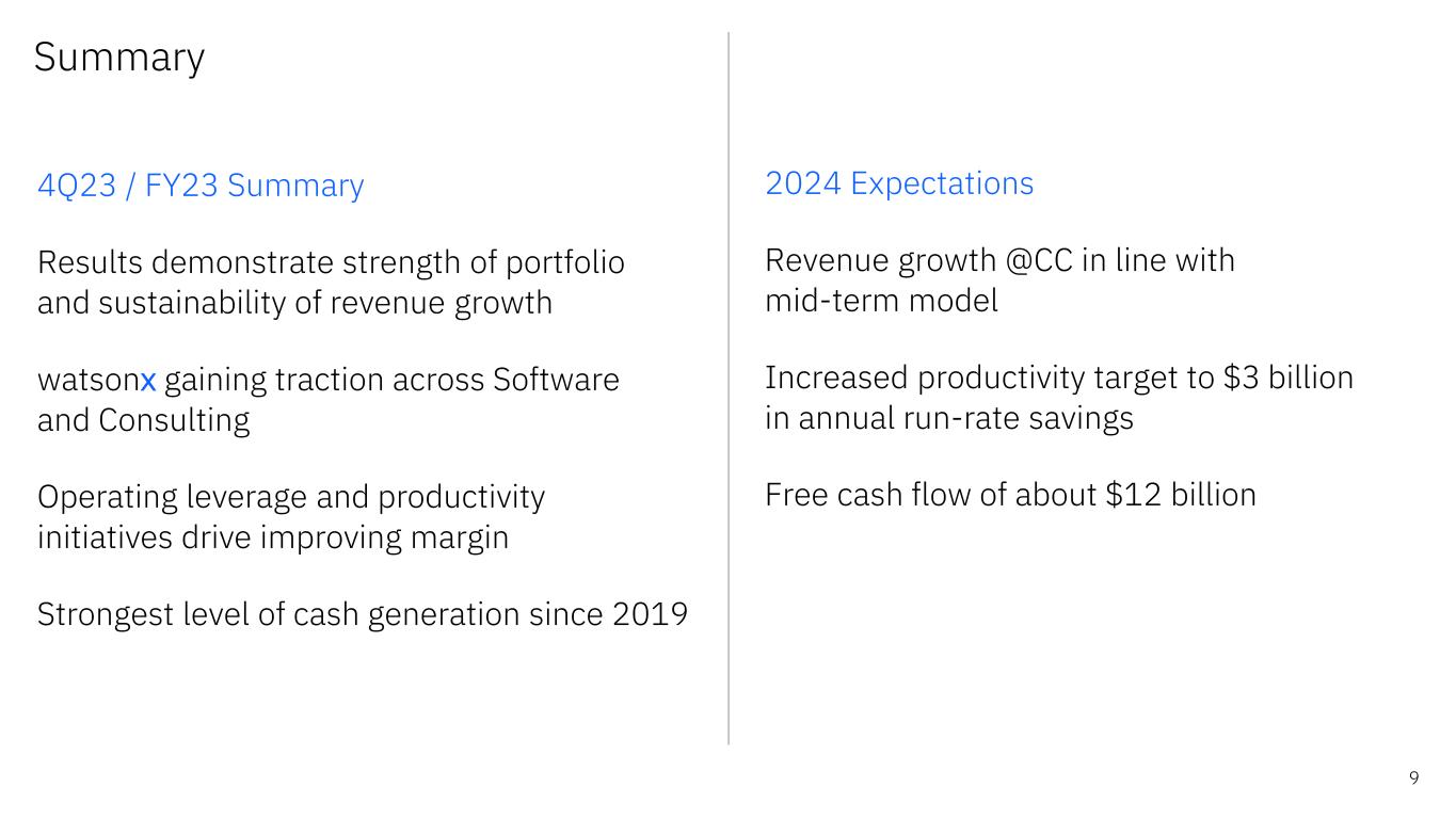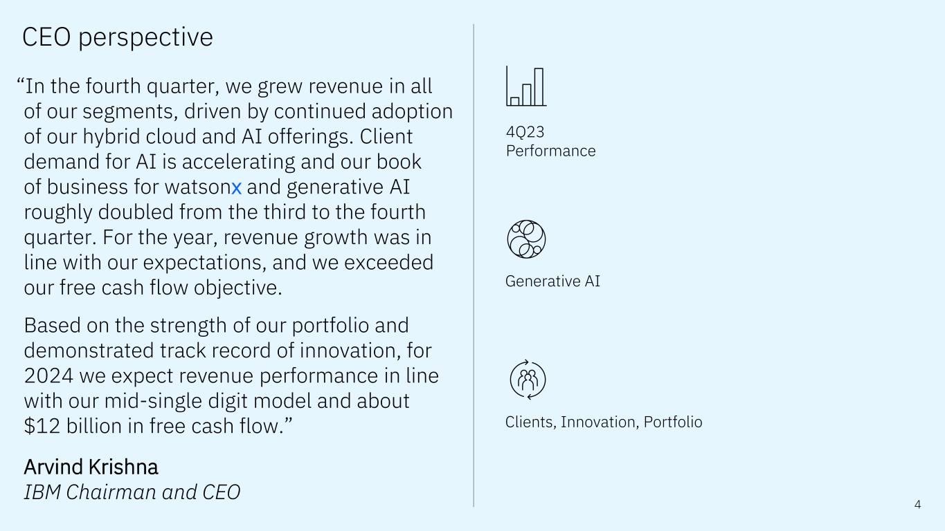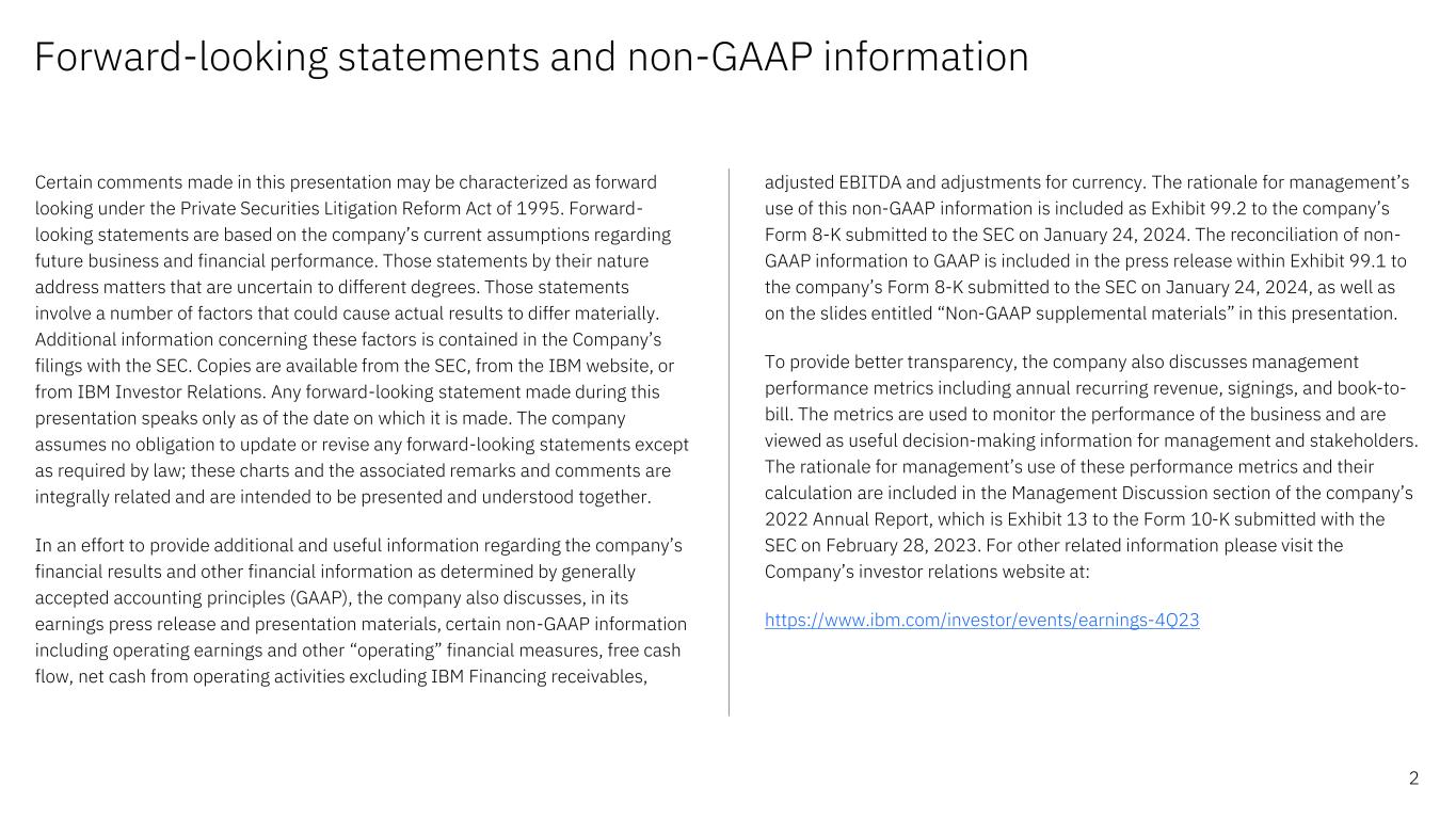 Forward-looking statements and non-GAAP information Certain comments made in this presentation may be characterized as forward looking under the Private Securities Litigation Reform Act of 1995. Forward- looking statements are based on the company’s current assumptions regarding future business and financial performance. Those statements by their nature address matters that are uncertain to different degrees. Those statements involve a number of factors that could cause actual results to differ materially. Additional information concerning these factors is contained in the Company’s filings with the SEC. Copies are available from the SEC, from the IBM website, or from IBM Investor Relations. Any forward-looking statement made during this presentation speaks only as of the date on which it is made. The company assumes no obligation to update or revise any forward-looking statements except as required by law; these charts and the associated remarks and comments are integrally related and are intended to be presented and understood together. In an effort to provide additional and useful information regarding the company’s financial results and other financial information as determined by generally accepted accounting principles (GAAP), the company also discusses, in its earnings press release and presentation materials, certain non-GAAP information including operating earnings and other “operating” financial measures, free cash flow, net cash from operating activities excluding IBM Financing receivables, adjusted EBITDA and adjustments for currency. The rationale for management’s use of this non-GAAP information is included as Exhibit 99.2 to the company’s Form 8-K submitted to the SEC on January 24, 2024. The reconciliation of non- GAAP information to GAAP is included in the press release within Exhibit 99.1 to the company’s Form 8-K submitted to the SEC on January 24, 2024, as well as on the slides entitled “Non-GAAP supplemental materials” in this presentation. To provide better transparency, the company also discusses management performance metrics including annual recurring revenue, signings, and book-to- bill. The metrics are used to monitor the performance of the business and are viewed as useful decision-making information for management and stakeholders. The rationale for management’s use of these performance metrics and their calculation are included in the Management Discussion section of the company’s 2022 Annual Report, which is Exhibit 13 to the Form 10-K submitted with the SEC on February 28, 2023. For other related information please visit the Company’s investor relations website at: https://www.ibm.com/investor/events/earnings-4Q23 2
